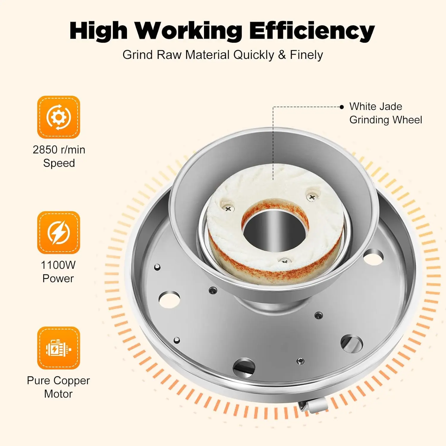 The 1100W pure copper motor, 2850r/min, and the white jade just grinding wheel used can grind the raw materials finely, so you can enjoy delicious soy milk, sesame milk, etc. Compared to the traditional peanut butter machine, this peanut butter maker machine keeps a low noise when operating.