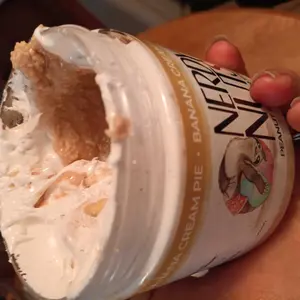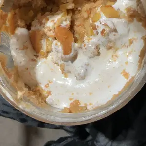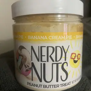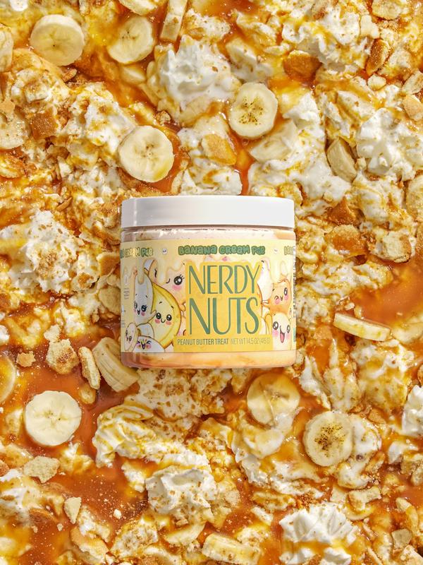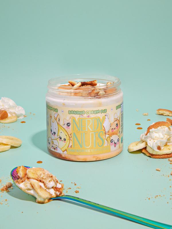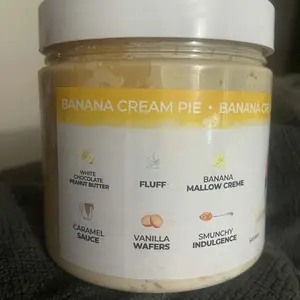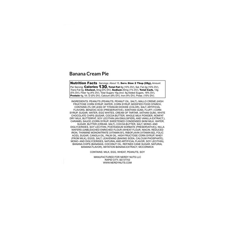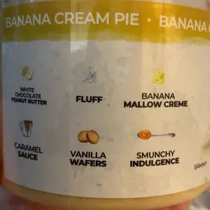 Banana Cream Pie starts with our white chocolate peanut butter layered on top of fluff and caramel sauce. We then top this off with banana infused cream, Nilla Wafers, and dried banana chips!