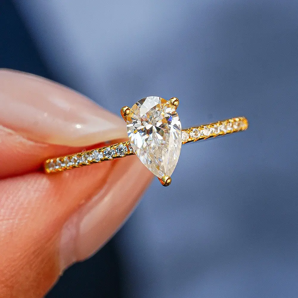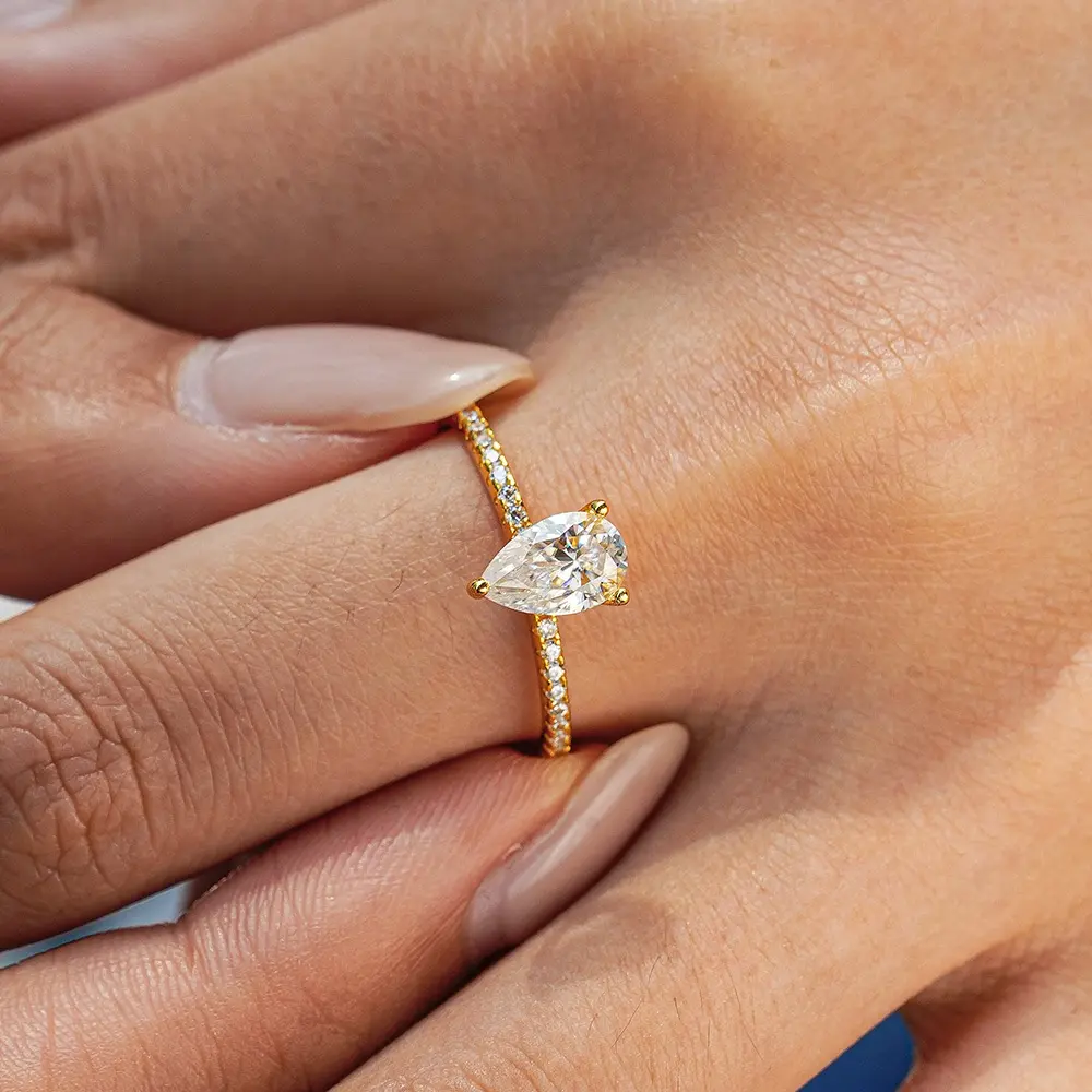 This stunning ring crafted to capture timeless beauty and modern sophistication. The ring features a dazzling pear-cut Synthetic Moissanite gemstone at its center, radiating brilliance and fire comparable to a natural diamond. The delicate pavé band is crafted from premium Sterling Silver and finished with a luxurious gold plating, ensuring both durability and shine.