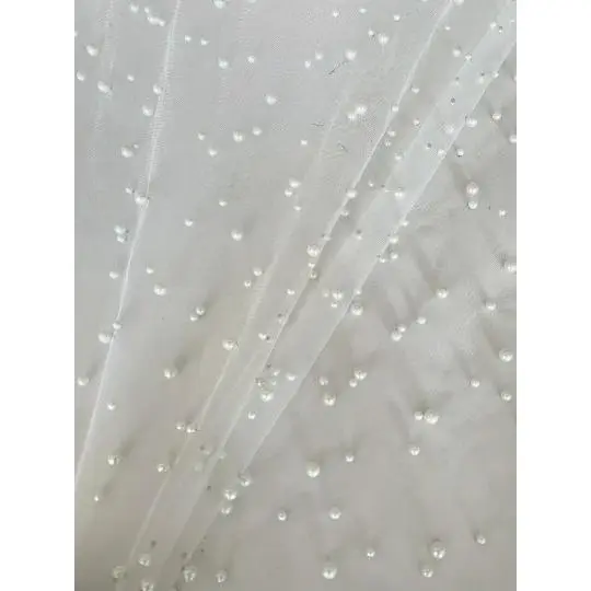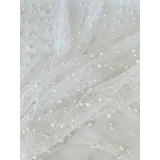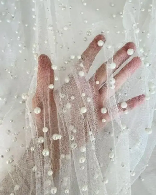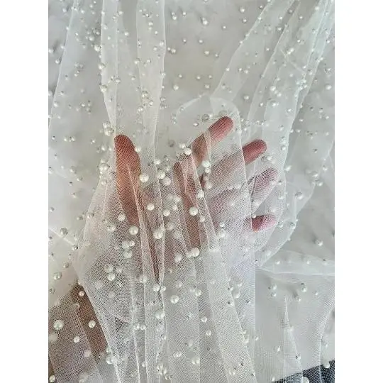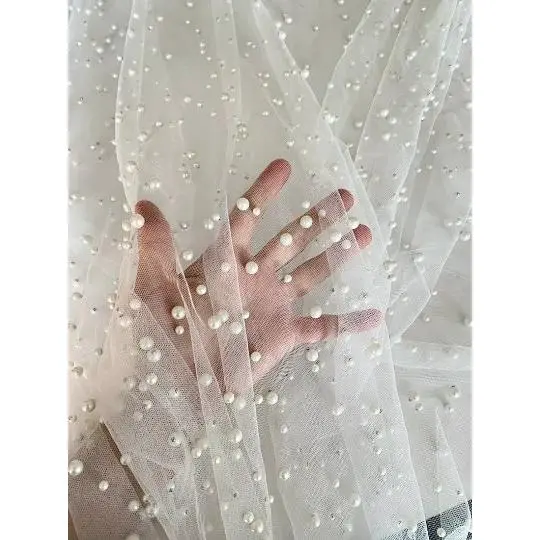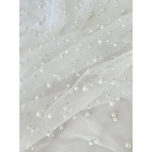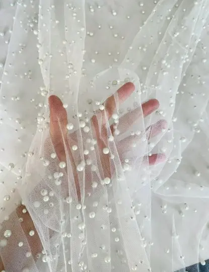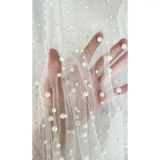 Pearl tulle fabric is a type of tulle fabric that has a pearl-like finish. It is made of synthetic fibers such as tulle, polyester, or mesh. Tulle is a lightweight, fine netting fabric that is commonly used for making bridal veils, gowns, ballet tutus, and other decorative items. To create the pearl finish, small beads or sequins are typically added to the tulle fabric during the manufacturing process. This gives the fabric a subtle shimmer and adds an extra touch of elegance to any garment or accessory made from pearl tulle fabric.