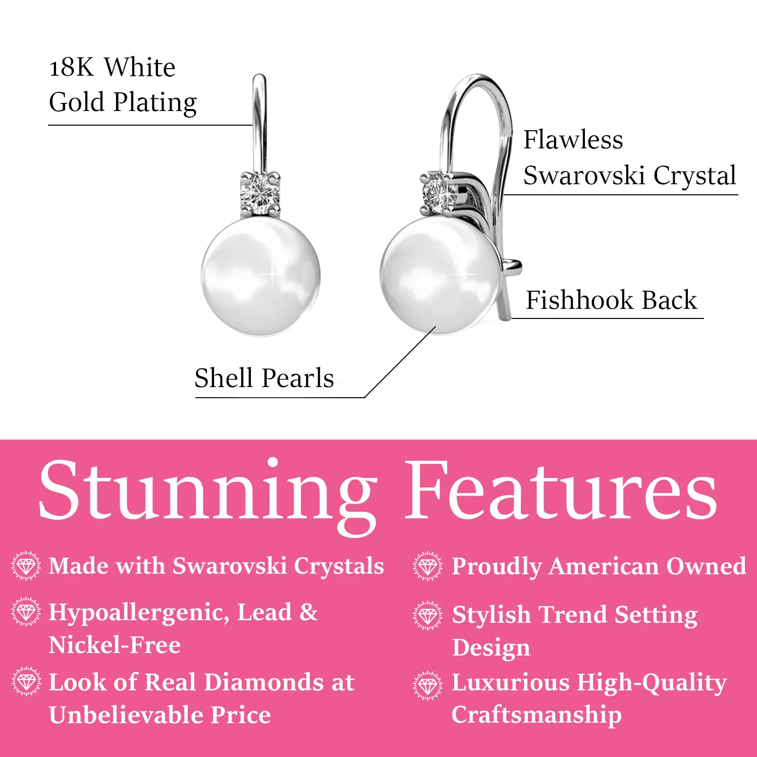 These drop earrings are expertly crafted using top-notch 18k white gold-plated brass, featuring a stunningĀ 8mm shell pearl and accentuating crystals.