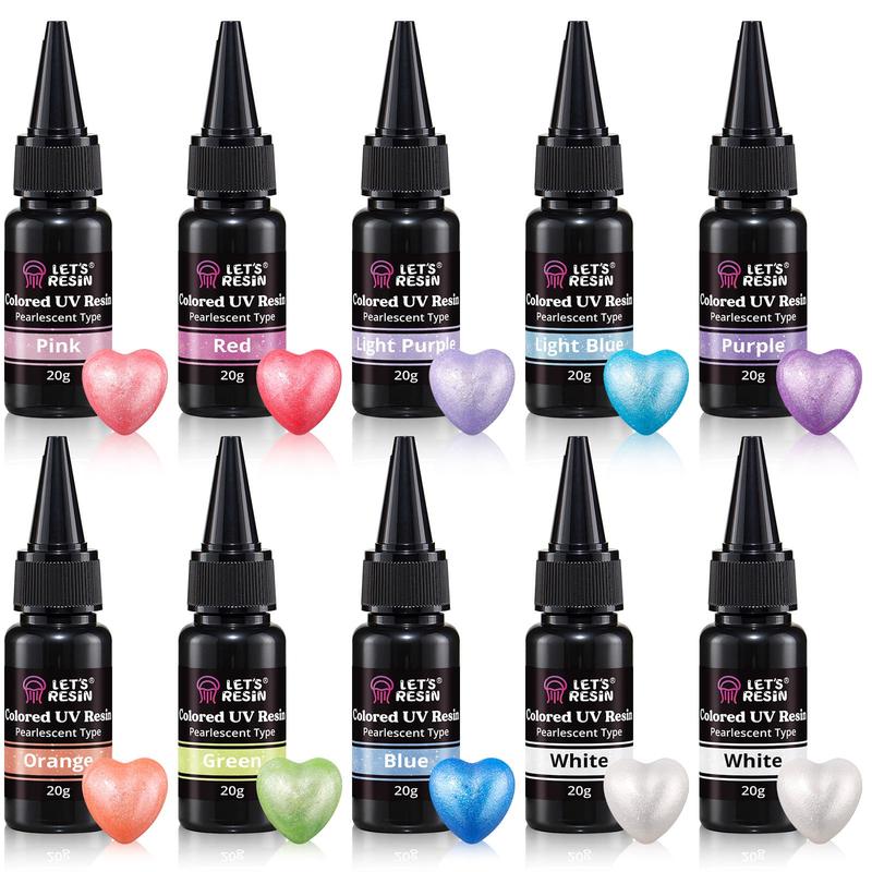 ·Stunning Pearlescent Effects: LET'S RESIN 10-color UV resin set comes pre-mixed with breathtaking pearlescent effects, eliminating the hassle of blending powder into regular UV resin. These pearlescent UV resins offer richer, more consistent hues compared to mixtures of plain resin and pearl powder, with fewer bubbles, faster curing, and easier application.