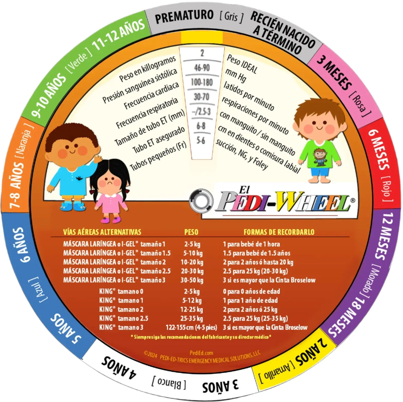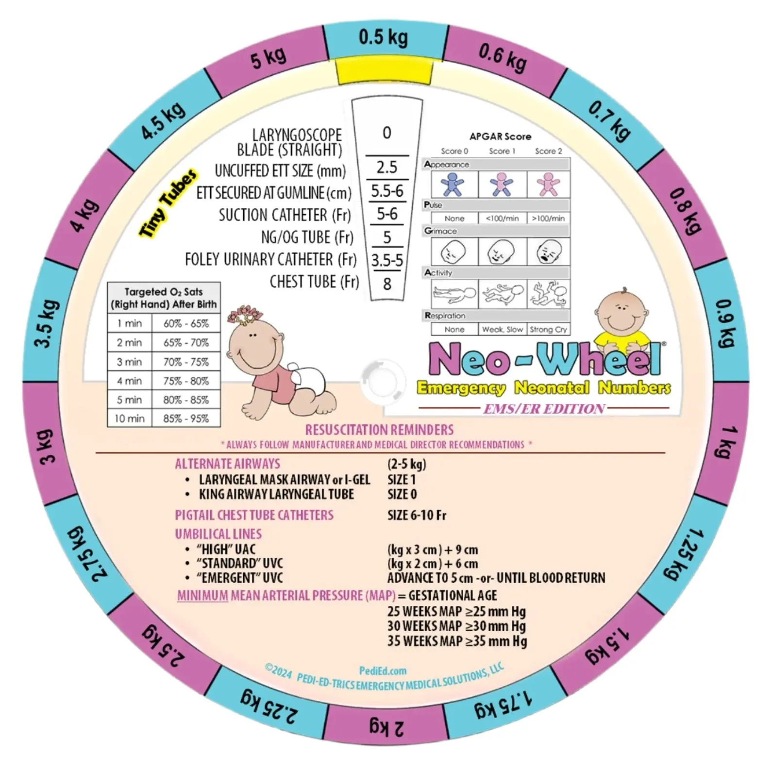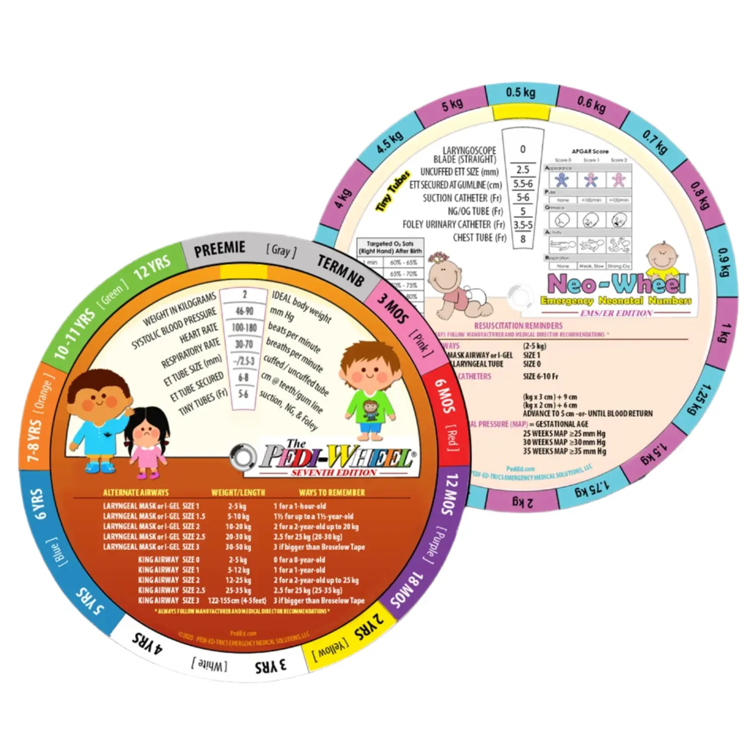 The Pedi-Wheel is perfect for every day use or as a study aid. Turn the dial to your patient’s age on one side and the following information appears in the window: ideal body weight, blood pressure, heart rate, respiratory rate, suggested sizes for ET tubes and the average length of a properly inserted ET tube at the teeth or gum line, and other tiny tube sizes.