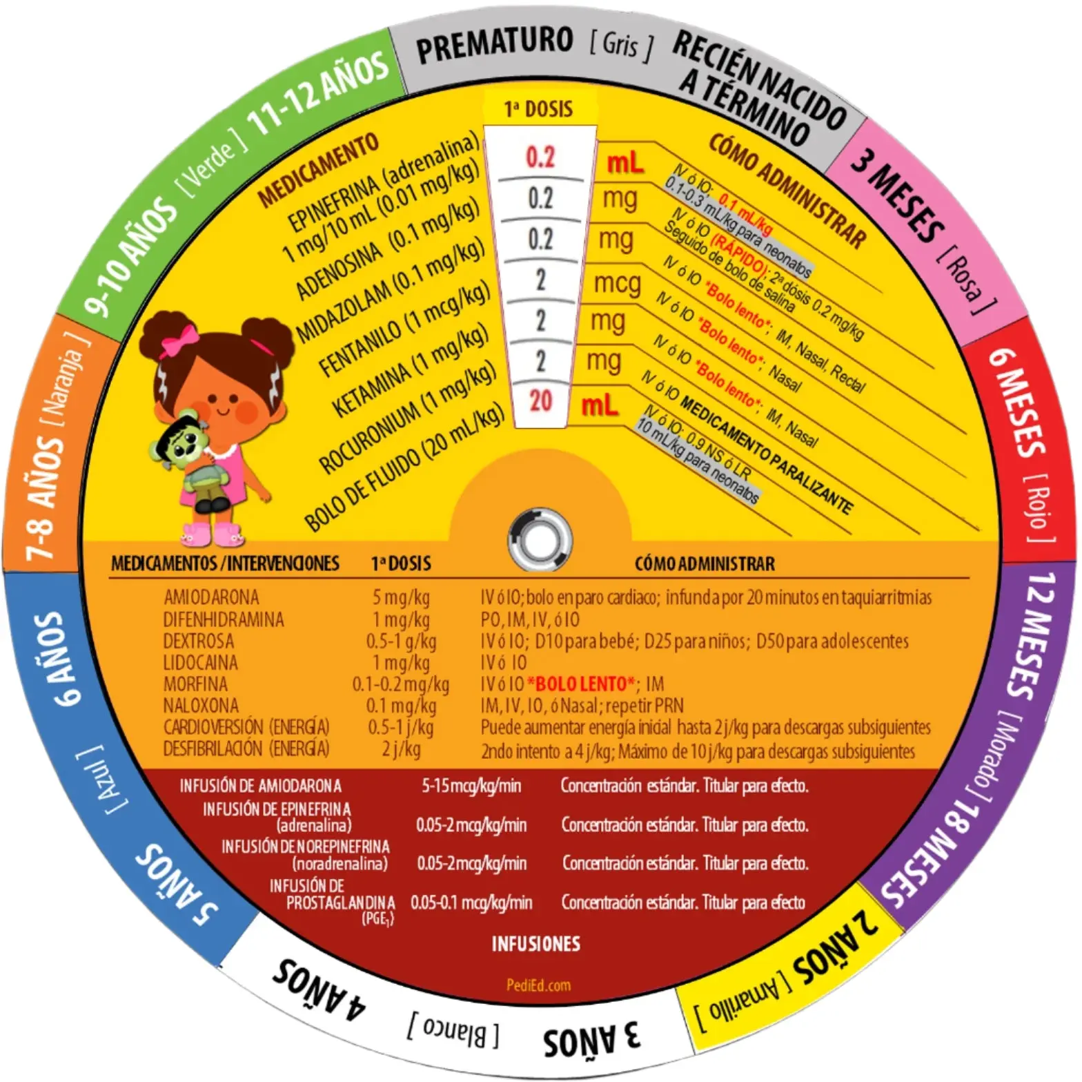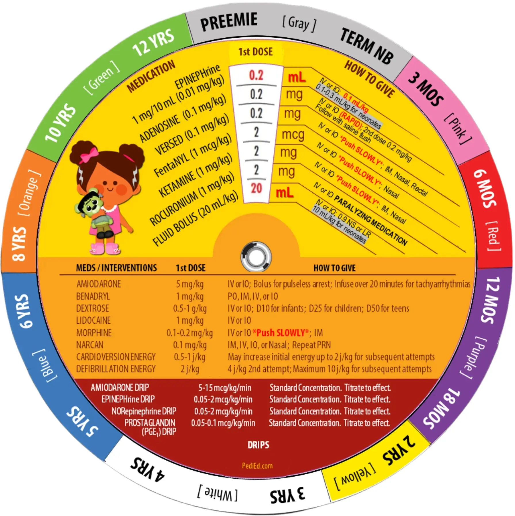 Sturdy and water-resistant, the Pedi-Wheel fits in pockets, clipboards, or crash carts. Ideal for paramedics, EMTs, nurses, physicians, and students. It includes Epi, Adenosine, Versed, Fentanyl, and additional medications. Drips include Amiodarone, Epi, Norepinephrine, and PGE1. Information on synchronized cardioversion and defibrillation energies is also displayed.