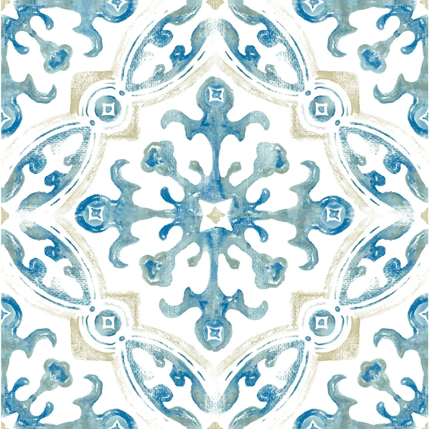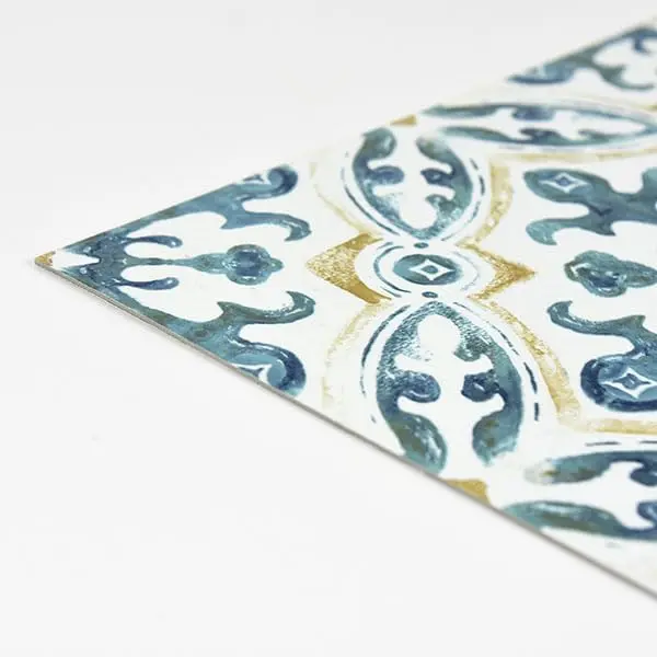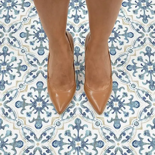 blue tan and white peel and stick floor tile with a spanish inspired medallion designpeel and stick to applyeasy installation no grout or special tools neededwater resistant and washablevirgin vinyl material with a textured low lustre finish and permanent adhesive makes tiles durable