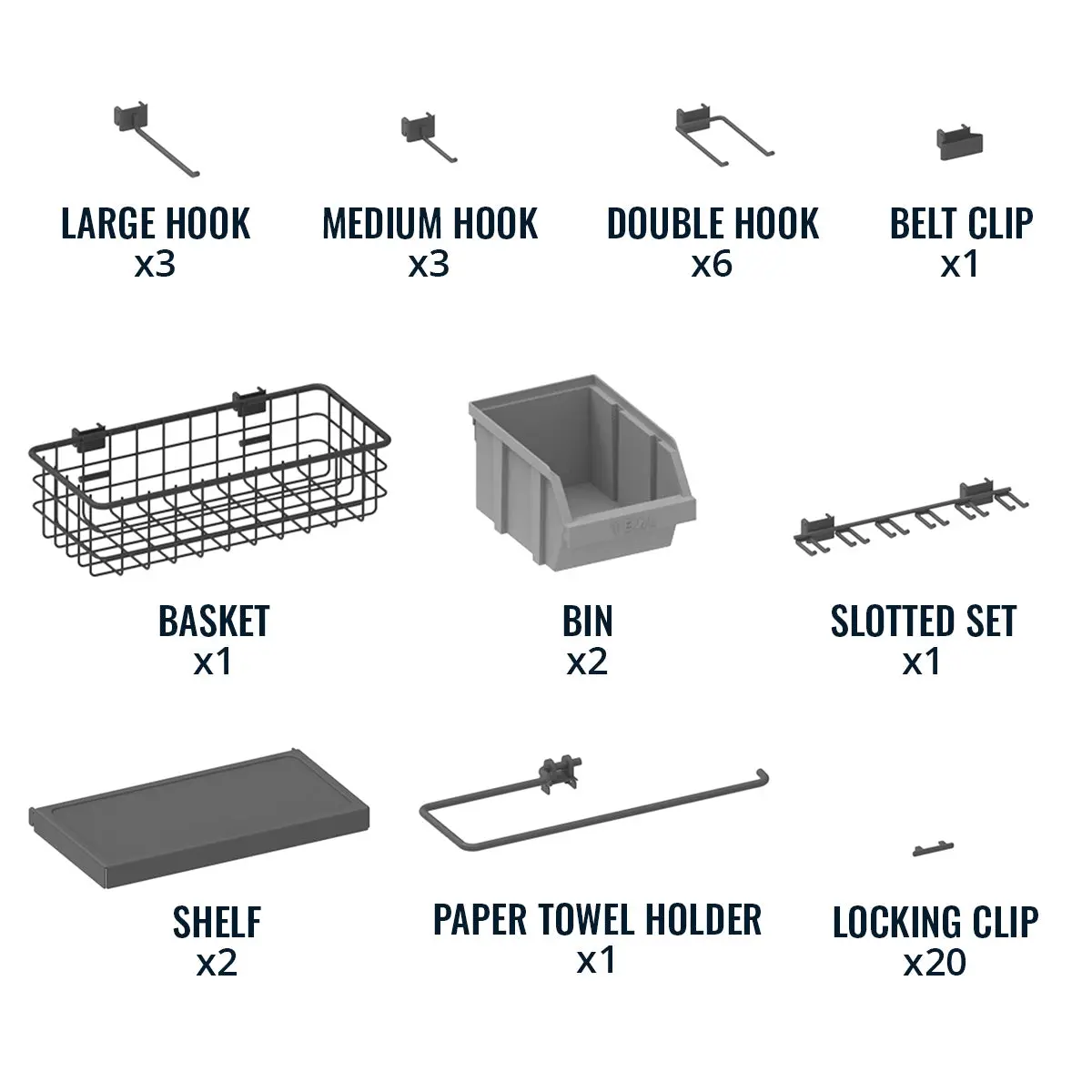 ·Includes (3) heavy-duty steel pegboard panels and (20) assorted storage attachments