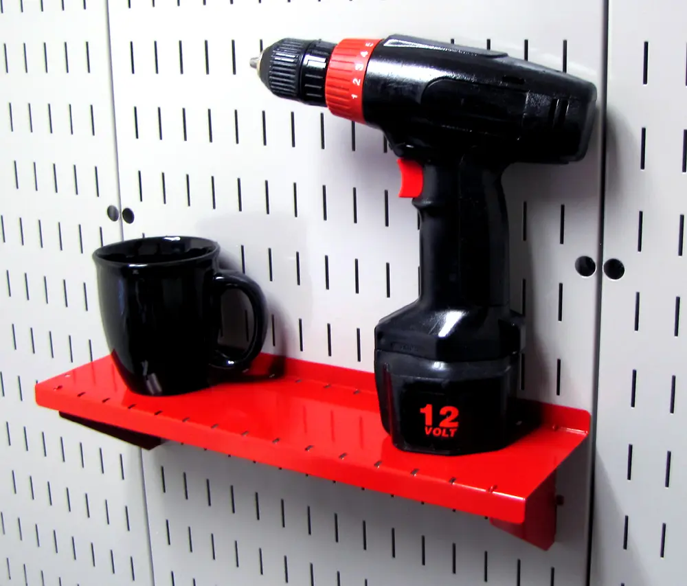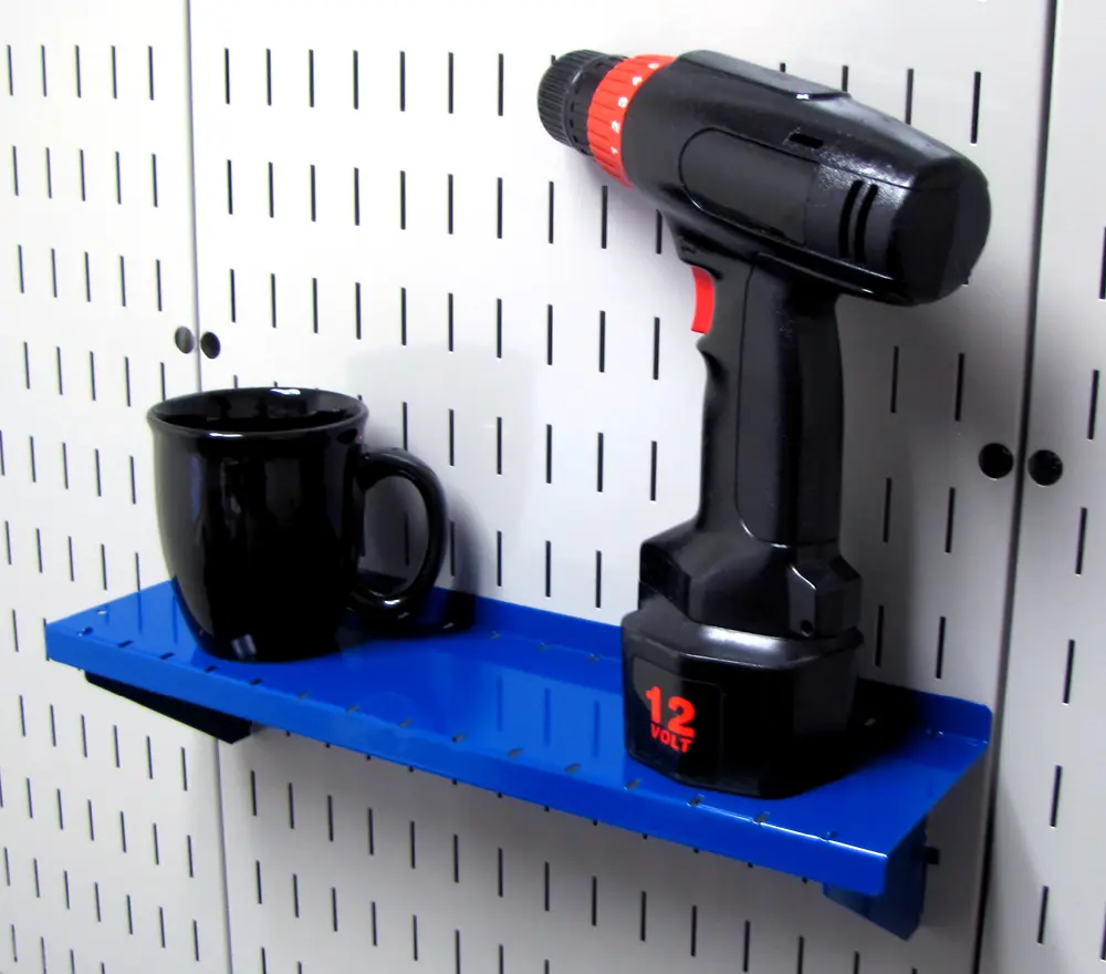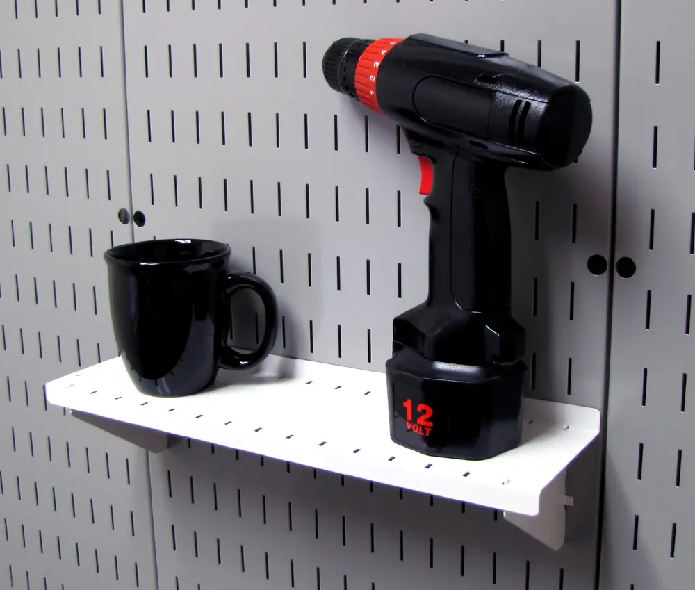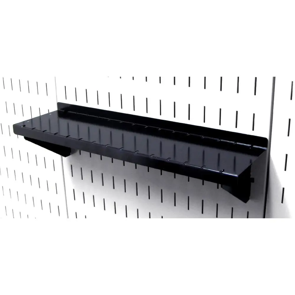 The Wall Control Pegboard 4in Deep x 16in Wide Pegboard Shelf Assembly for Wall Control's Pegboard and Slotted Tool Board is made from heavy duty 14 gauge steel shelf brackets and offers great pegboard shelf storage. Unlike most pegboard brands that fall short when it comes to shelving, Wall Control pegboard shelves are heavy-duty and up to the task with their solid construction and attractive finish. Wall Control Slotted Metal Pegboard Shelves and Supplies feature a scratch and rust resistant baked-on finish. These more secure and stable toolboard accessories are for use with the slots found in Wall Control Metal Pegboard tool board panels only. Wall Control Slotted Toolboard accessories offer a patented engagement that requires two deliberate motions up-and-down to engage and disengage the hooks. This feature makes Wall Control Slotted Pegboard accessories less likely to fall out of the tool board than conventional peg hooks that can easily fall off when tools are removed. Although Wall Control Metal Pegboard Panels will accept conventional 1/4in pegboard accessories as well as Wall Control Slotted Accessories the Slotted Secure Tool Board Shelf Assembly included here is only for use with Wall Control Metal Pegboard Panels and Tool Boards. Wall Control Pegboard Products are Made in the USA