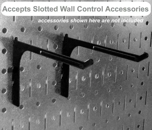 The Wall Control metal pegboard panels offer both slots and holes to accept slotted tool board accessories as well as conventional 1/4in peg board hooks making this pegboard extremely versatile by offering the user multiple options with pegboard hooks, brackets, shelves, and general toolboard and pegboard supplies selection.