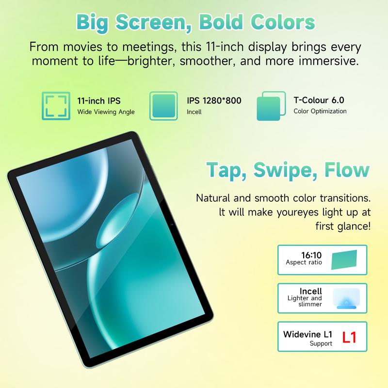 ·【11 inch Touchscreen & HD Camera】 The android 15.0 tablet has a 11 in IPS display, 1280x800 resolution, a tablet with sensitive screen sensing, equipped with 5MP+13MP dual cameras, narrow edge screen design. The high-definition screen brings you more detailed natural colors and advanced visual effects. The "reading mode" can reduce harmful light to the eyes so you get to enjoy a comfortable night reading.
