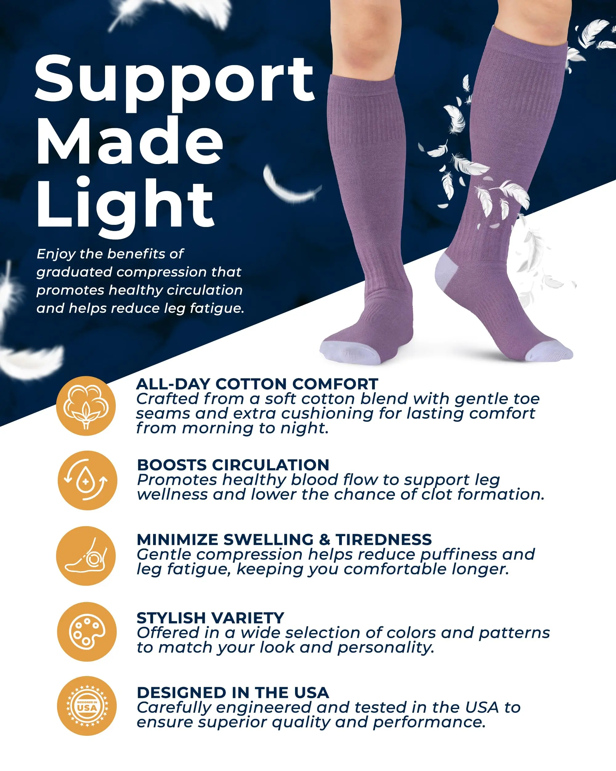 Soft Cotton Comfort - Made with breathable cotton, these knee high ladies compression socks keep your legs cool and odor-free even during the most active parts of your day. The smooth toe seams are gentle on sensitive skin, making these socks ideal for all-day wear.