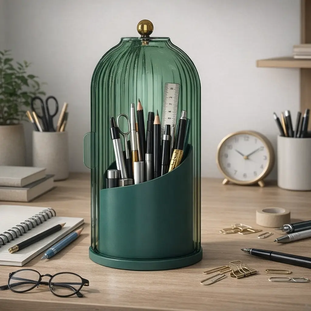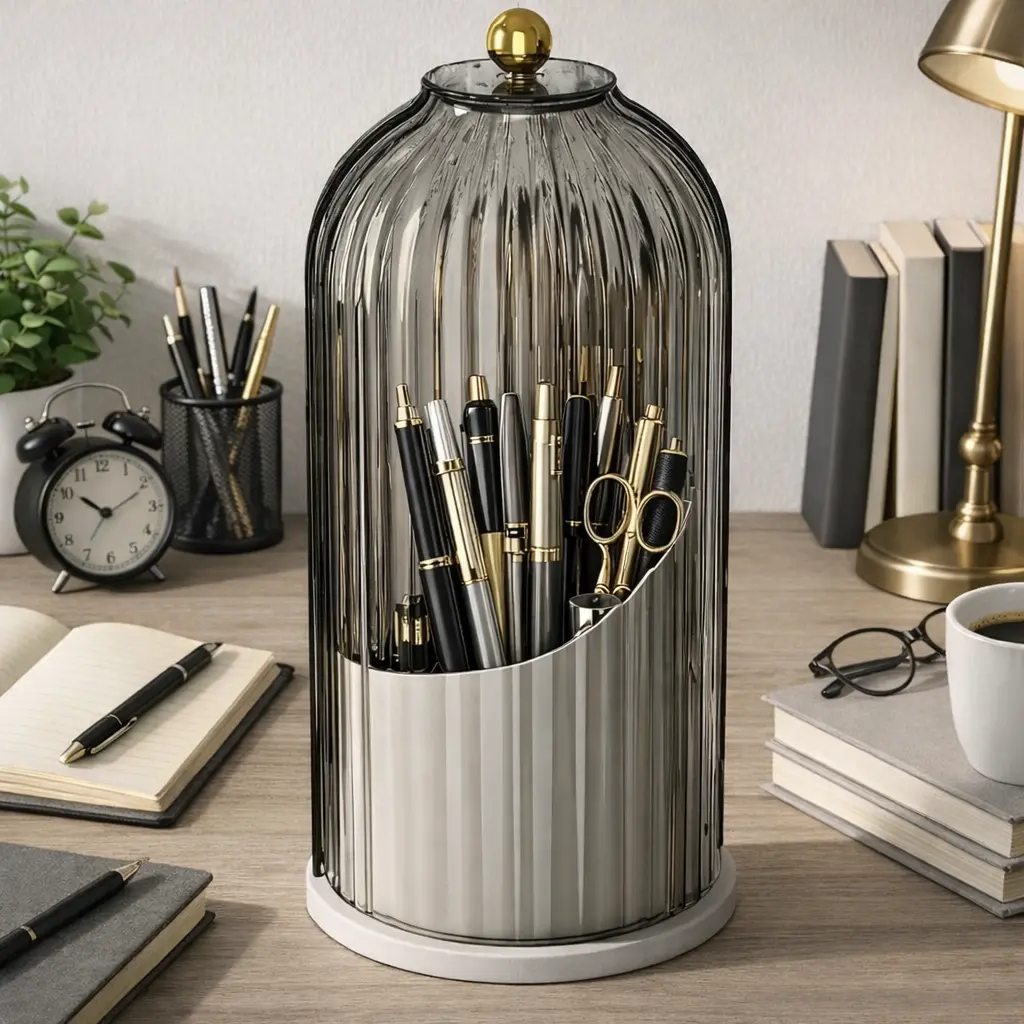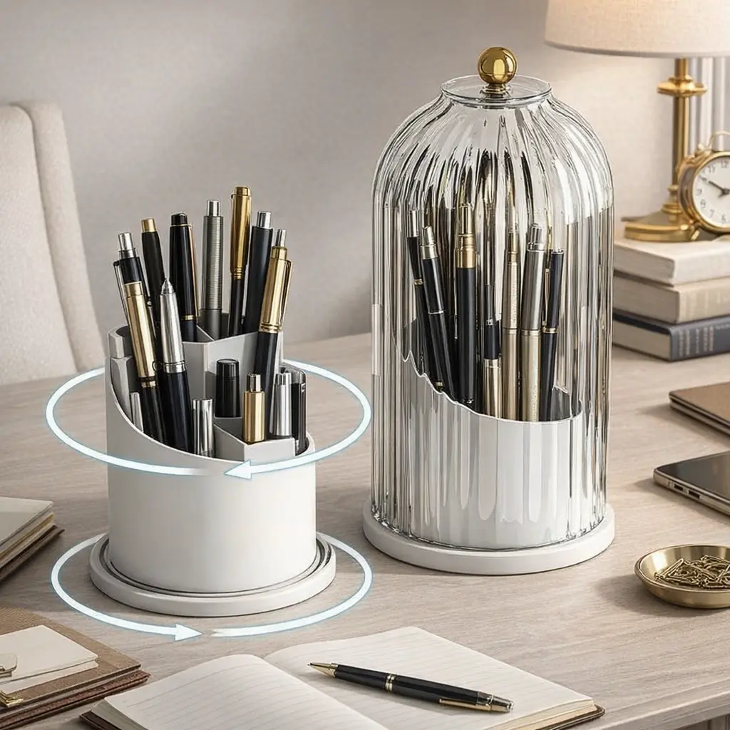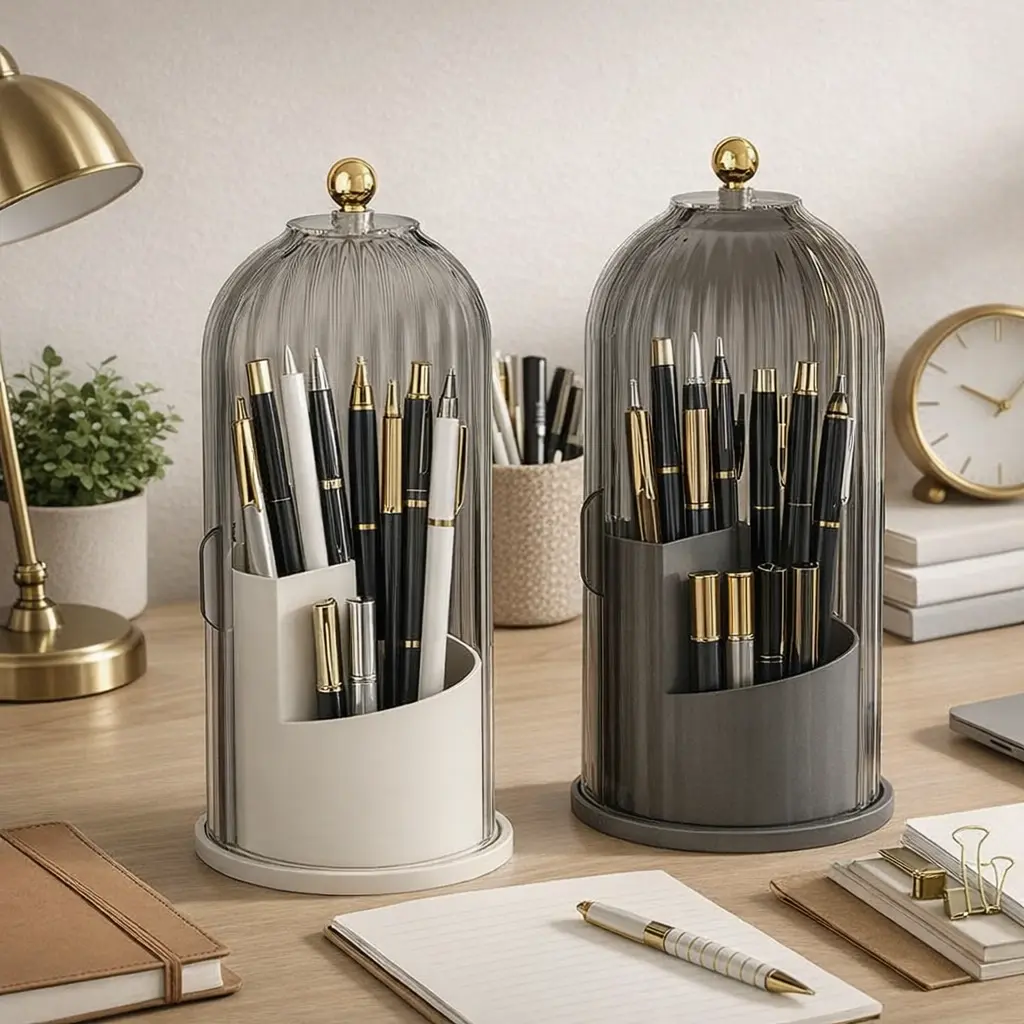 5. Pen Holder Organizer with Lid,360 Rotating Clear Dustproof Desk Organizer for Pens, Pencils & Office Supplies