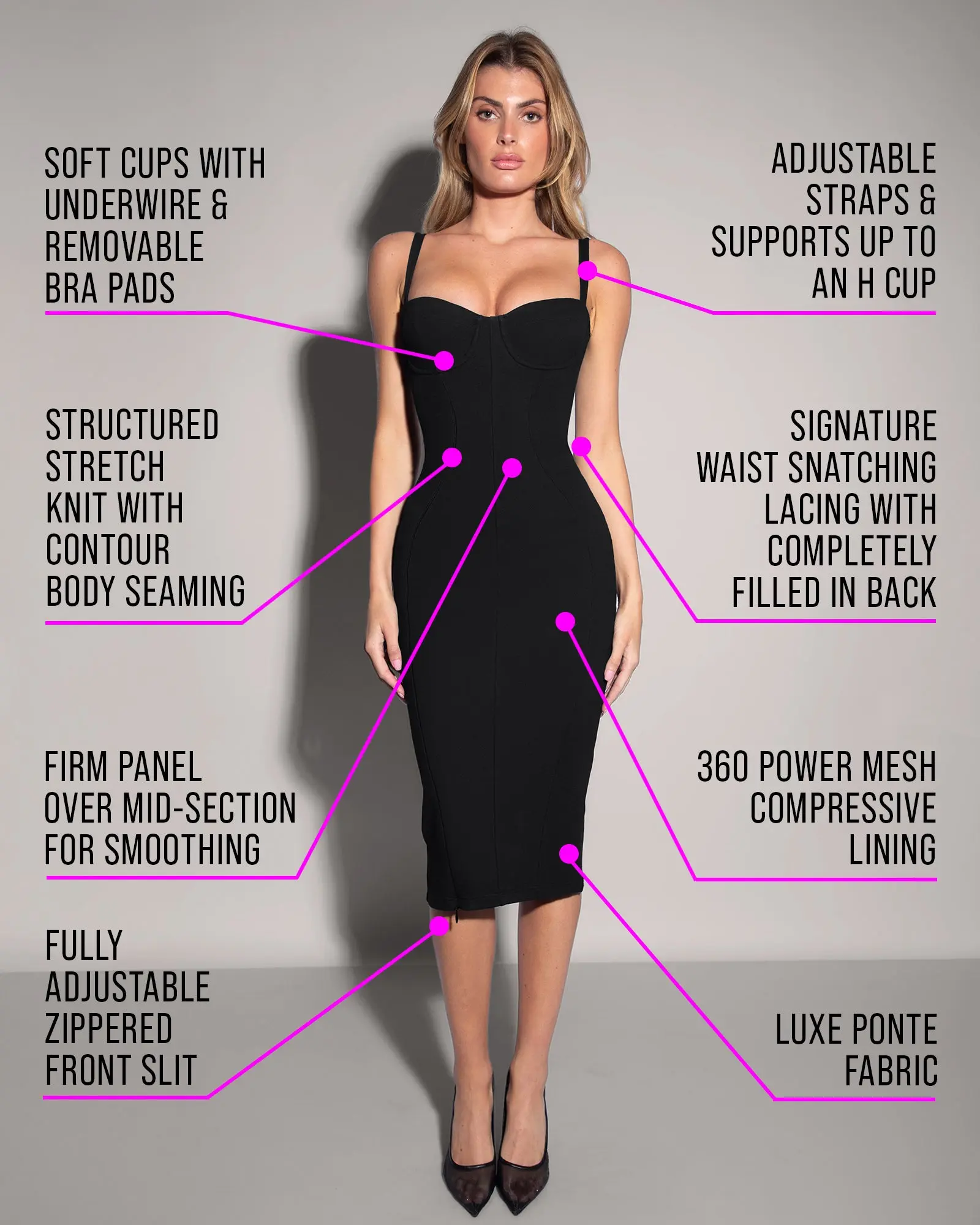 Introducing our Seamed Lushy Pencil Dress in black. This casual style dress features soft fabric and adjustable straps. Perfect for women'swear, it offers a comfortable and supportive fit. The dress includes a fully adjustable zippered front slit for easy wear and customization.