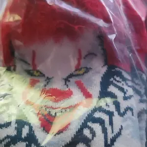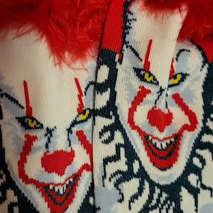 Channel the terror of Stephen King's "It" with these chilling IT Horror Movie-inspired Pennywise 3D Fuzzy Hair Men's Crew Socks. great for fans of Pennywise the Dancing Clown and the horror movie franchise "IT", these novelty men's socks capture the sinister charm of the infamous villain, featuring a detailed graphic of Pennywise’s eerie smile with 3D fuzzy red hair for a standout effect. The ribbed cuff helps keep these crew socks snug and secure, making them a great addition to any "IT" inspired cosplay or Halloween costume. These socks aren't just for Halloween, they make a great birthday or Christmas gift for any fan of the "IT" movie franchise or horror films in general. Made from a comfortable and durable blend of 70% polyester, 20% nylon, and 10% spandex, these socks fit men's shoe sizes 6-12, offering comfort for all-day wear. Whether you're binging the IT franchise, horror movies, or attending a horror-themed event, these socks are a must-have for any horror aficionado. GREAT Product Comfortable and Secure Fit: The ribbed cuff ensures the socks stay in place throughout the day, making them ideal for everyday wear or for complementing your IT-inspired cosplay or Halloween costume Durable Fabric Blend: Crafted from 70% polyester, 20% nylon, and 10% spandex, these socks are designed for long-lasting comfort and durability, withstanding repeated wear and washes while maintaining their shape great Gift for Horror Fans: Whether for a birthday, Christmas, or a special occasion, these socks make an excellent gift for any fan of horror movies, especially those who love Pennywise and the "IT" franchise Fits Men's Shoe Sizes 6-12: These socks are tailored to fit men's shoe sizes 6-12, offering a flexible and snug fit for a wide range of foot sizes, while the 3D hair adds a distinctive and fun twist