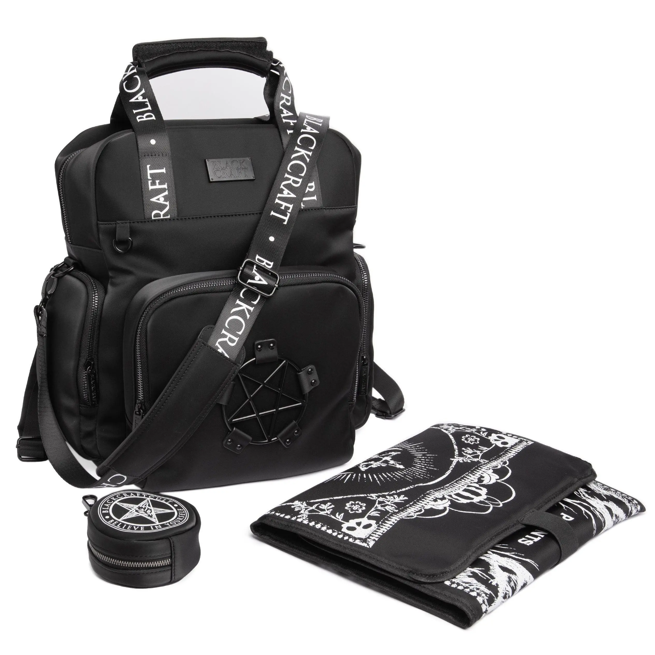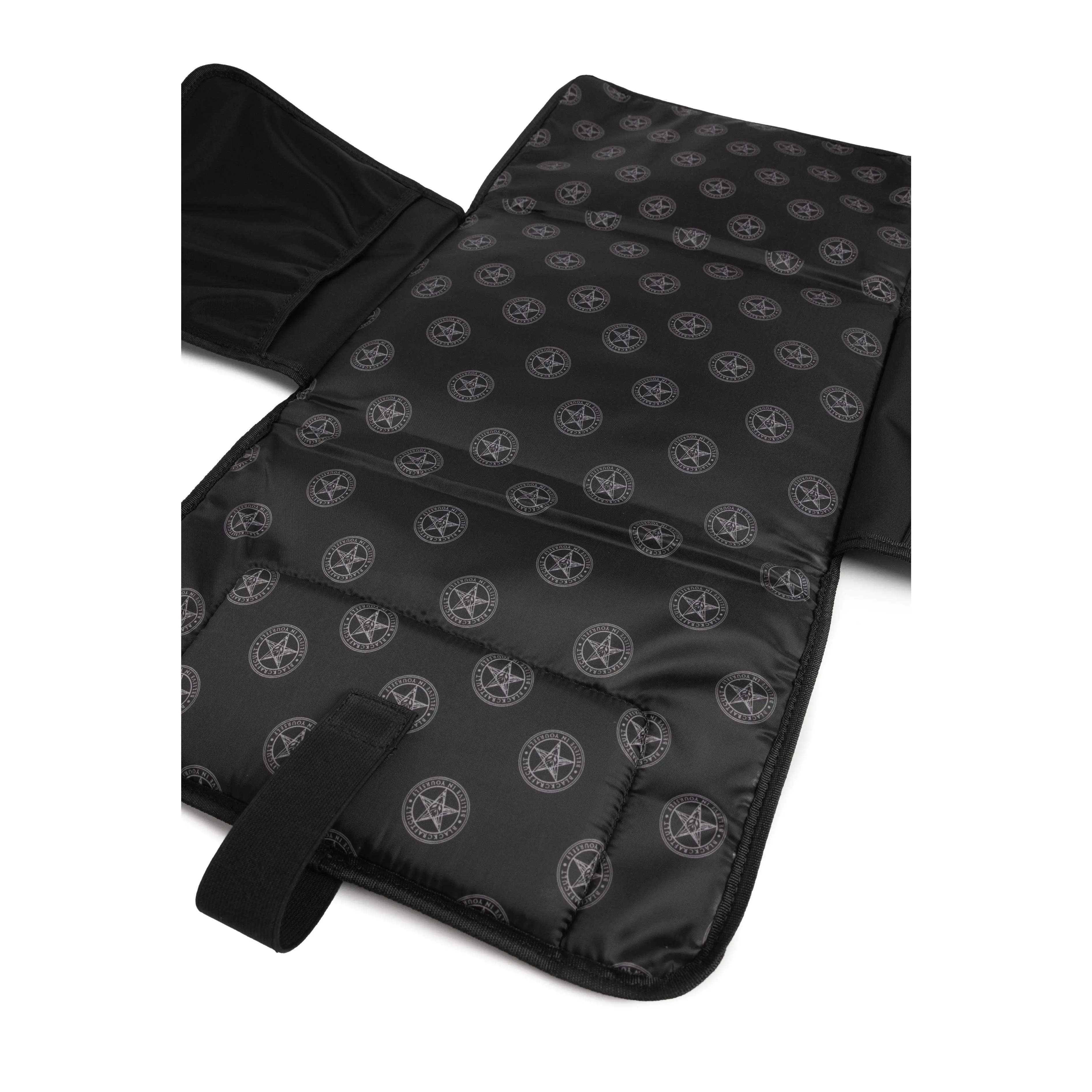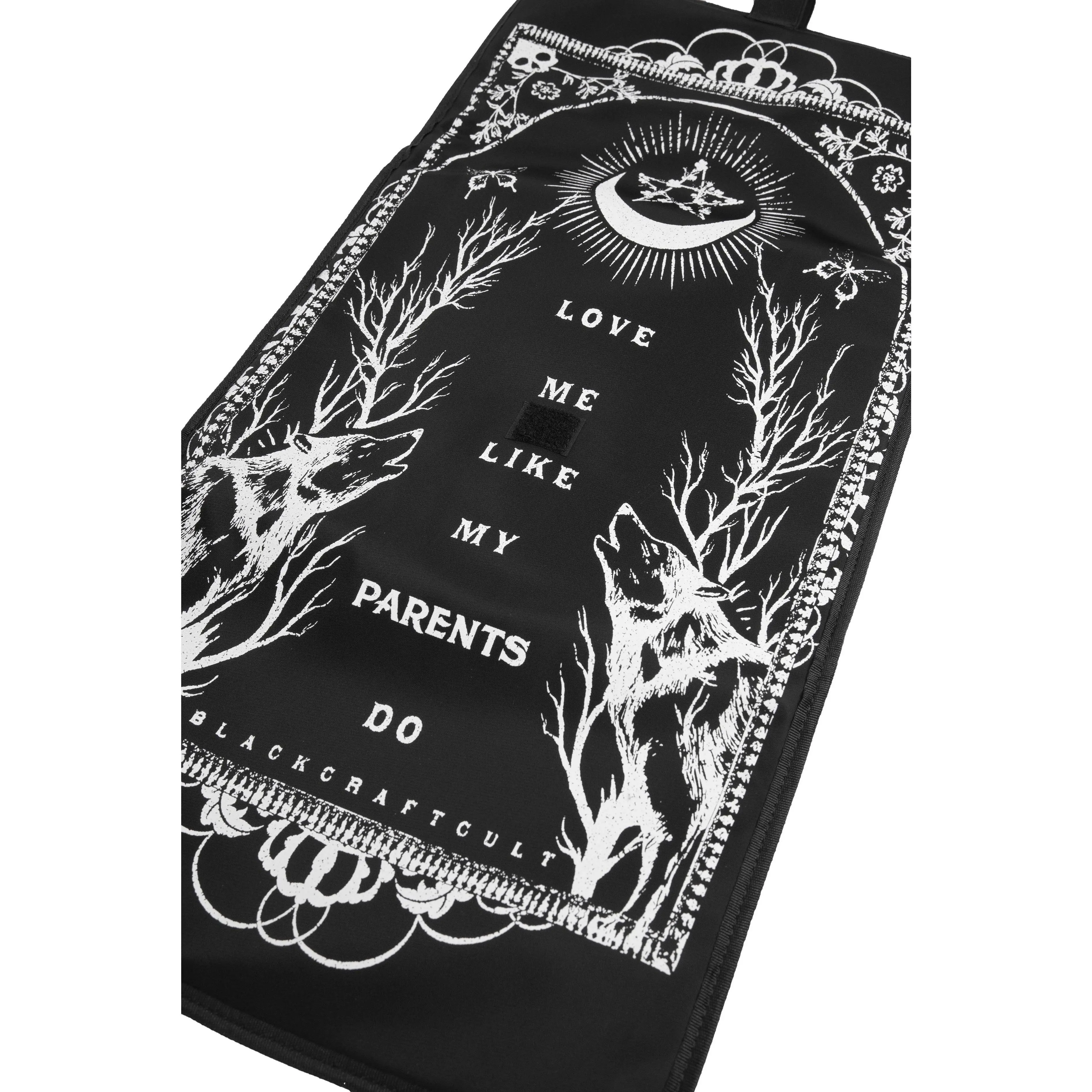 Black nylon diaper bag with top handle, removable/adjustable strap, and backpack straps for multiple options for wear! Matte black Blackcraft hardware and pentagram harness. Features 2 side pockets, 1 large front pocket with 3 additional pockets inside (great for baby bottles!), and 3 interior pockets. Also includes a "Love Me Like My Parents Do" diaper changing pad and keychain attachment for pacifiers.