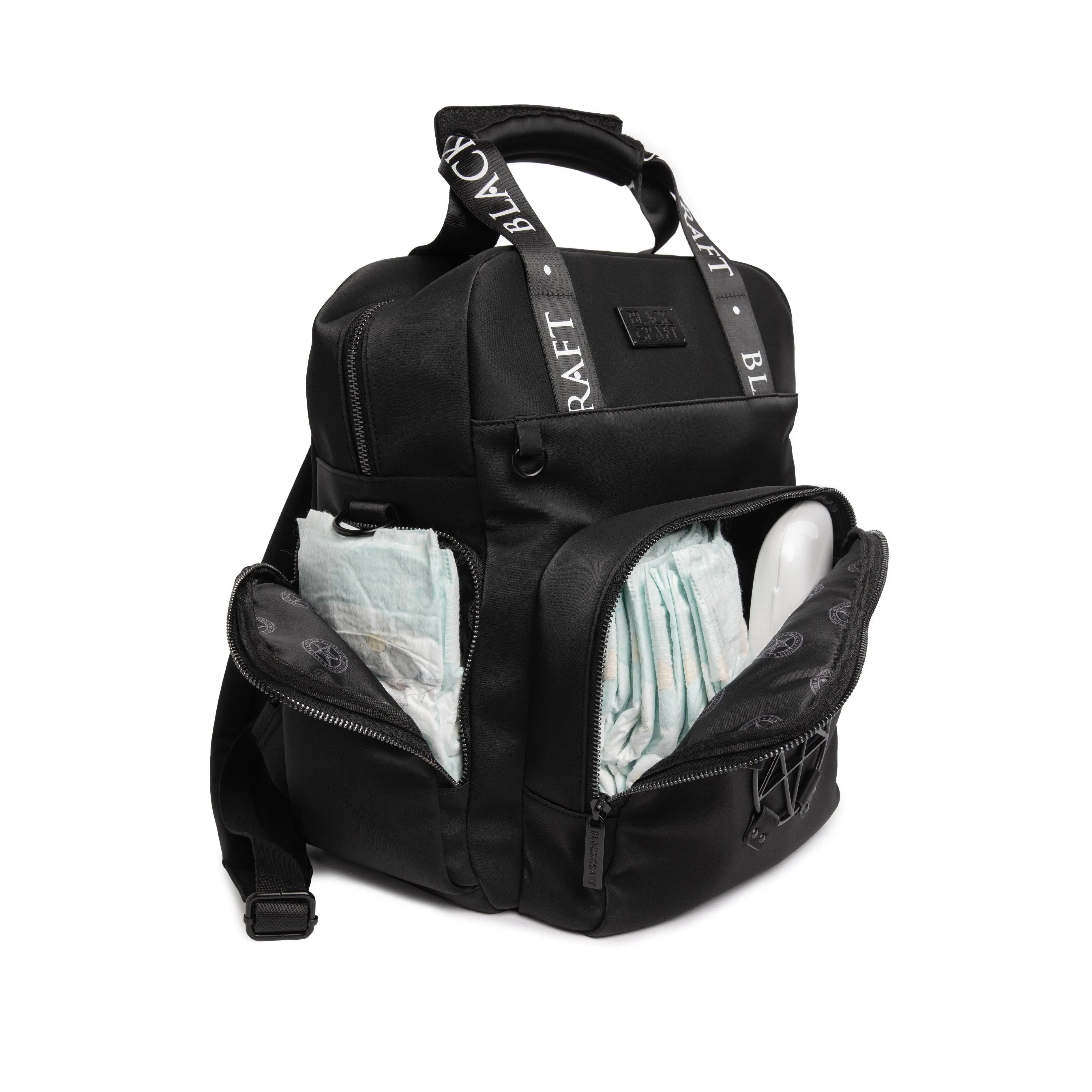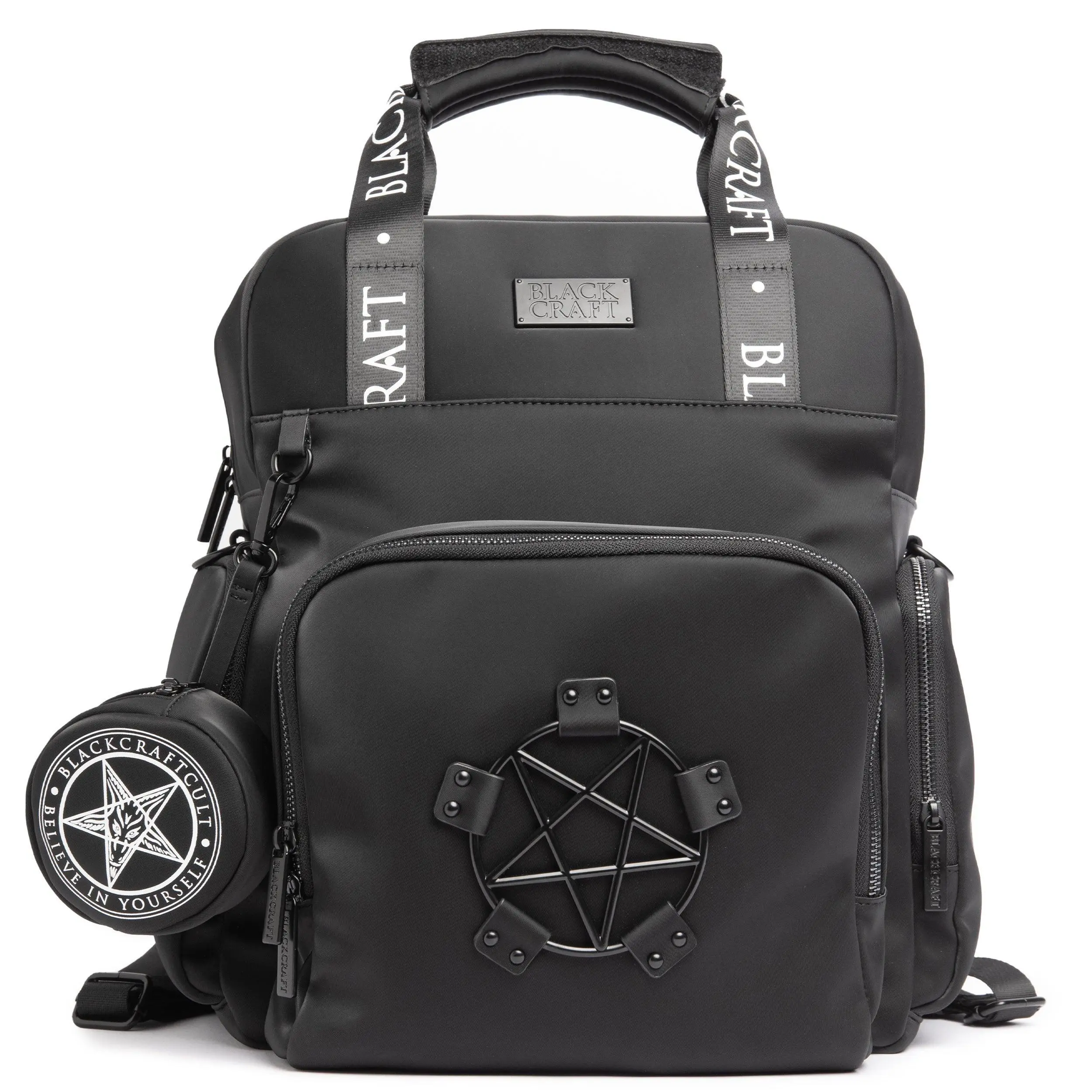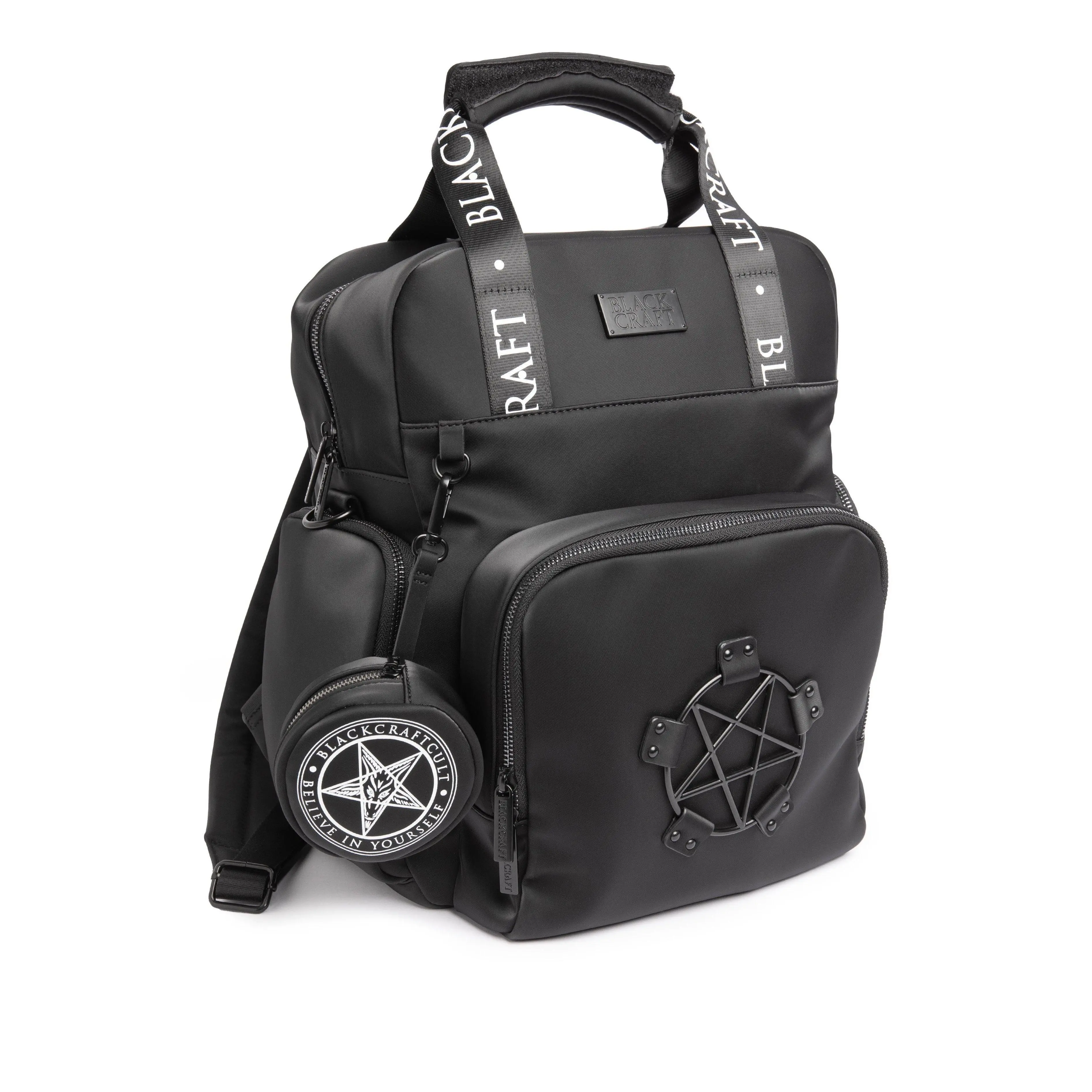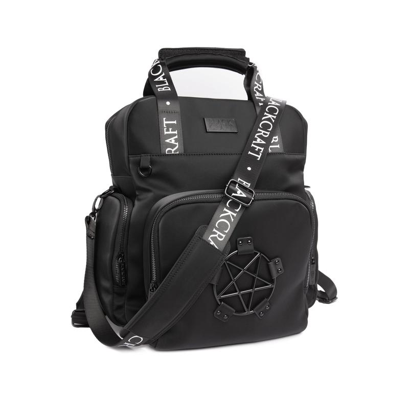 Black nylon diaper bag with top handle, removable/adjustable strap, and backpack straps for multiple options for wear! Matte black Blackcraft hardware and pentagram harness. Features 2 side pockets, 1 large front pocket with 3 additional pockets inside (great for baby bottles!), and 3 interior pockets. Also includes a "Love Me Like My Parents Do" diaper changing pad and keychain attachment for pacifiers.