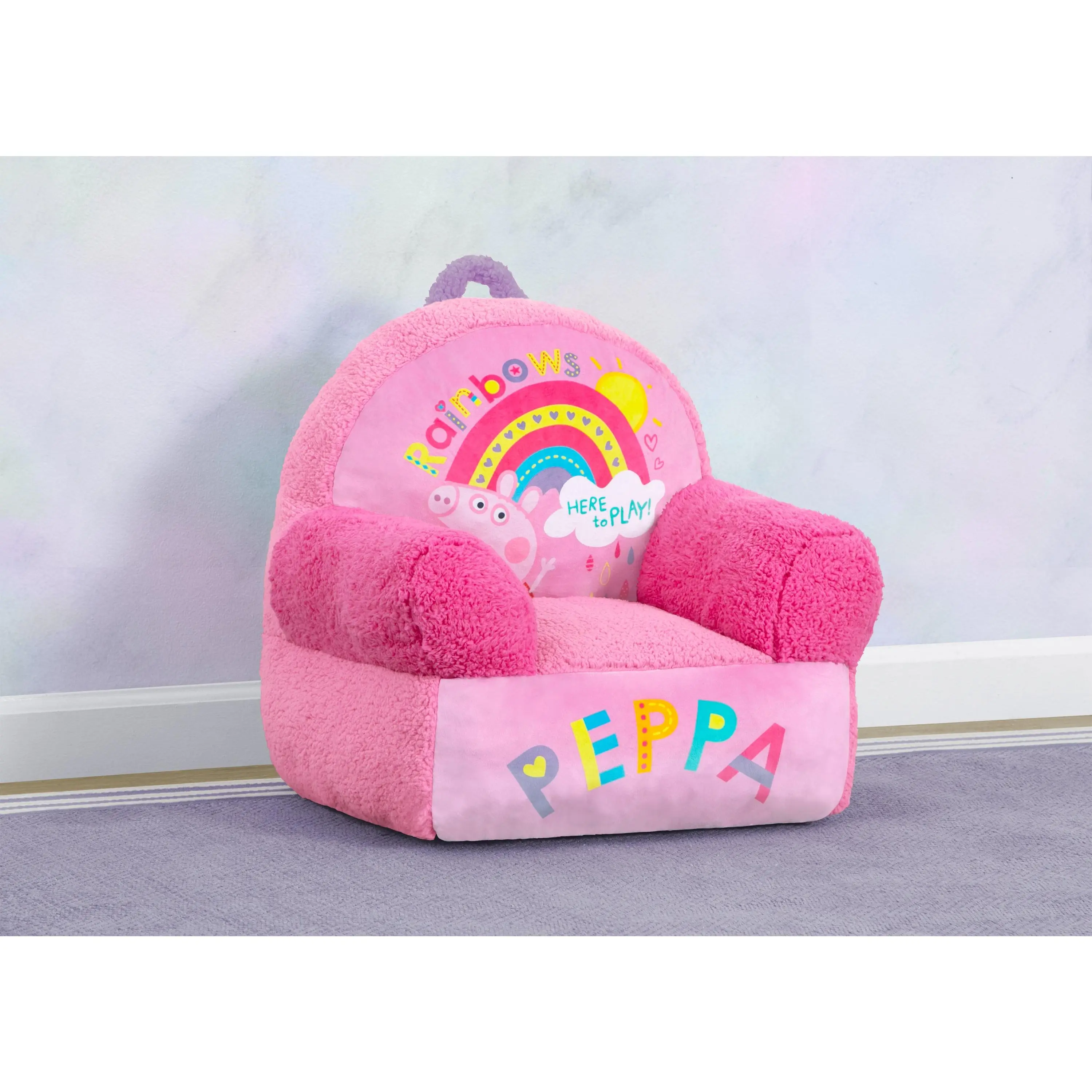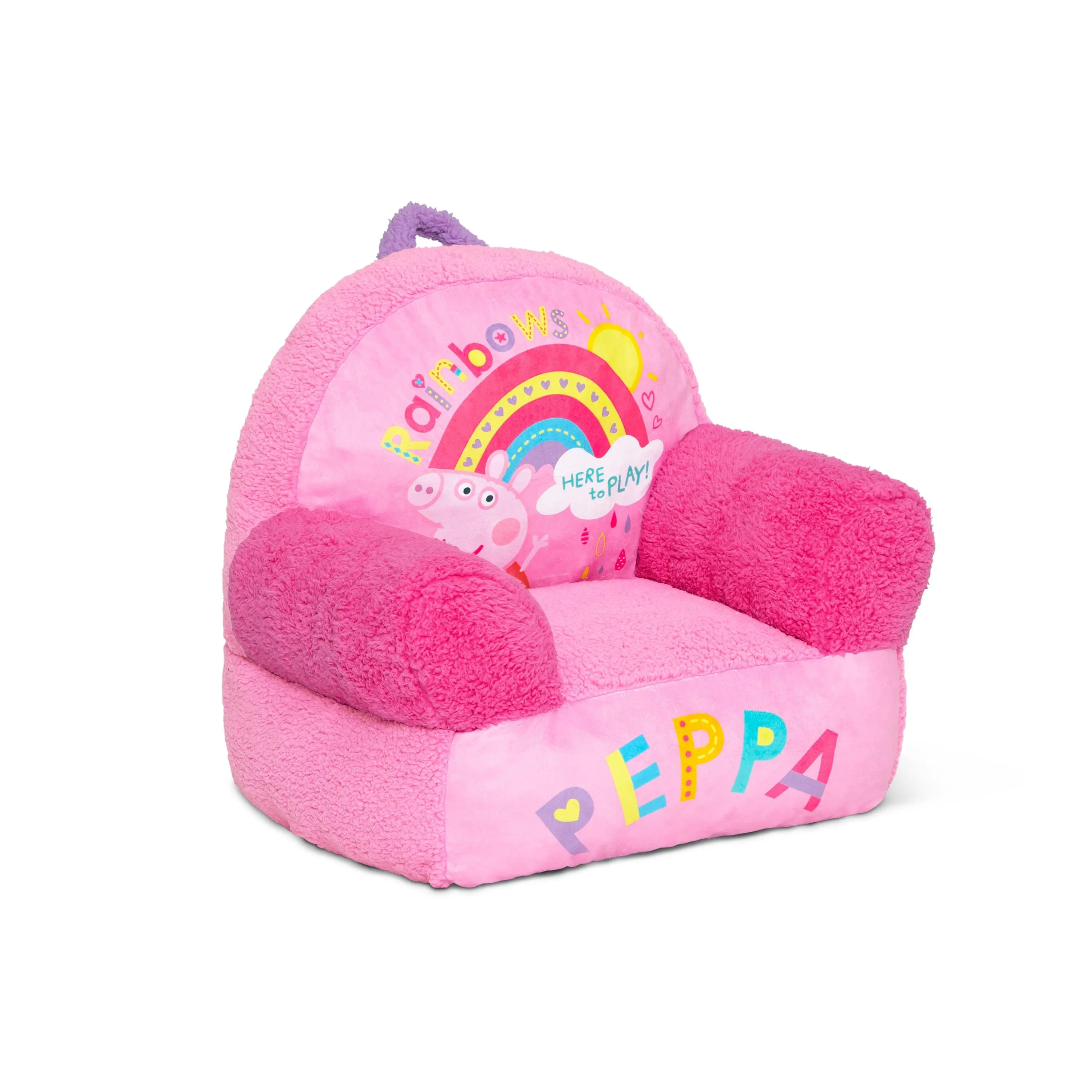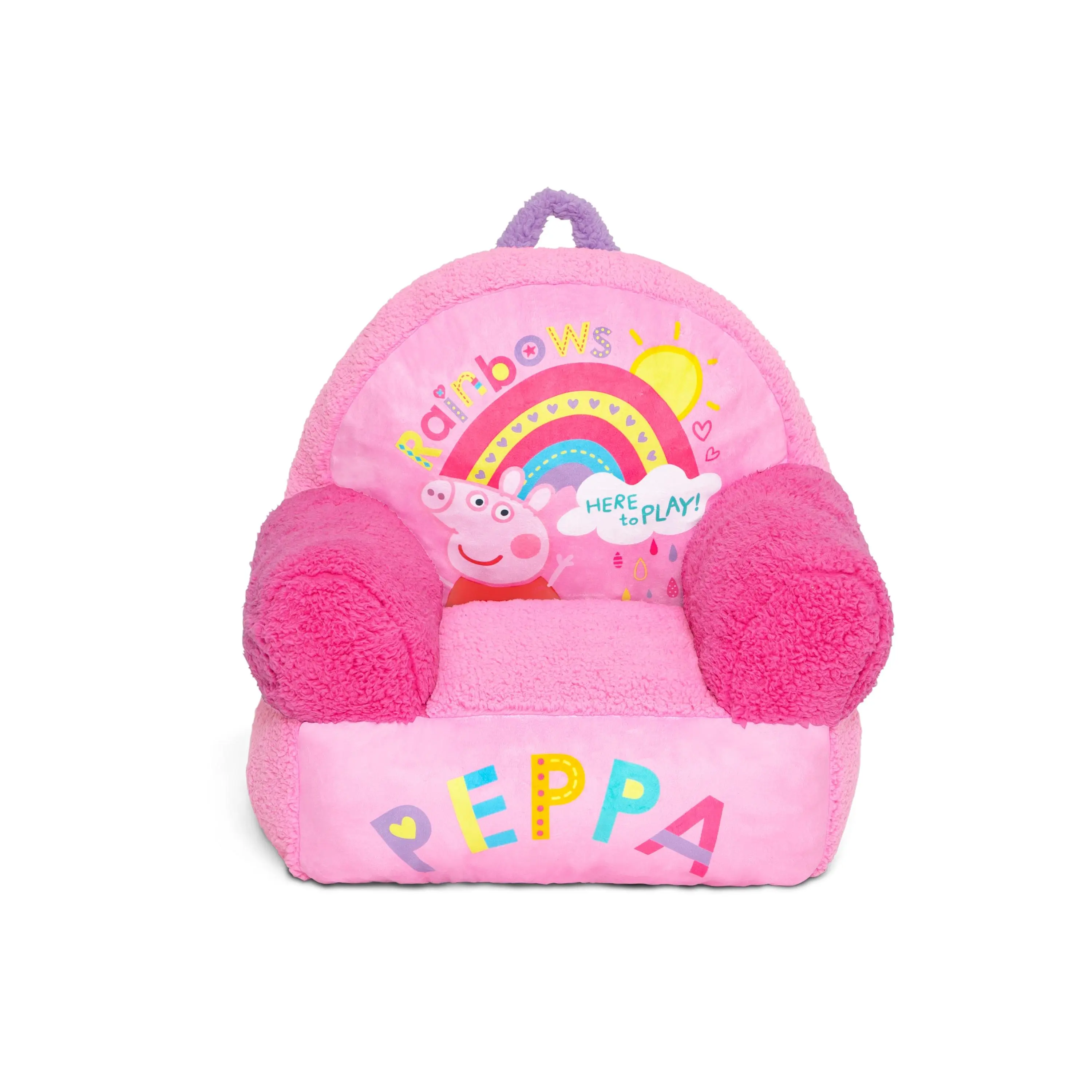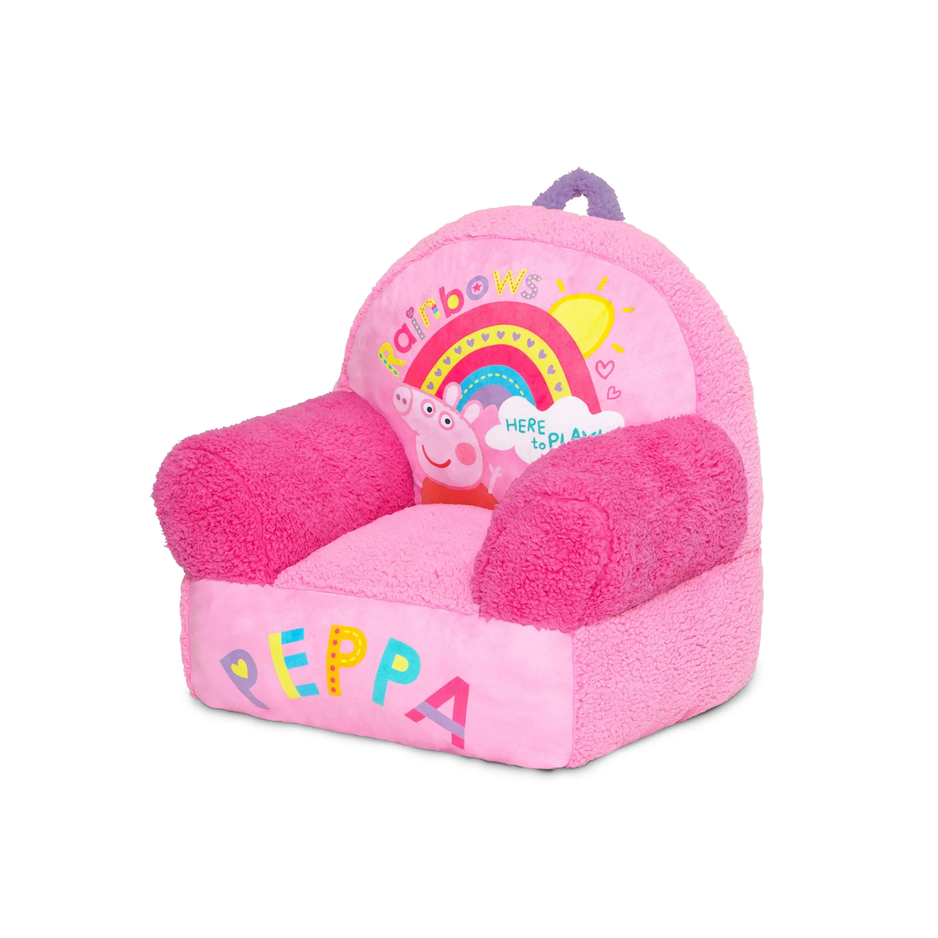 The ultimate playmate, this Peppa Pig Cozee Buddy Chair by Delta Children is comfy and durable. This plush chair features colorful Peppa graphics, super-soft sherpa detailing, and an easy-to-grab handle that makes it easy to move around the house! The foam design of this comfy chair offers kids a cozy companion for reading, relaxing or snuggling, making it perfect for playrooms and kids bedrooms.