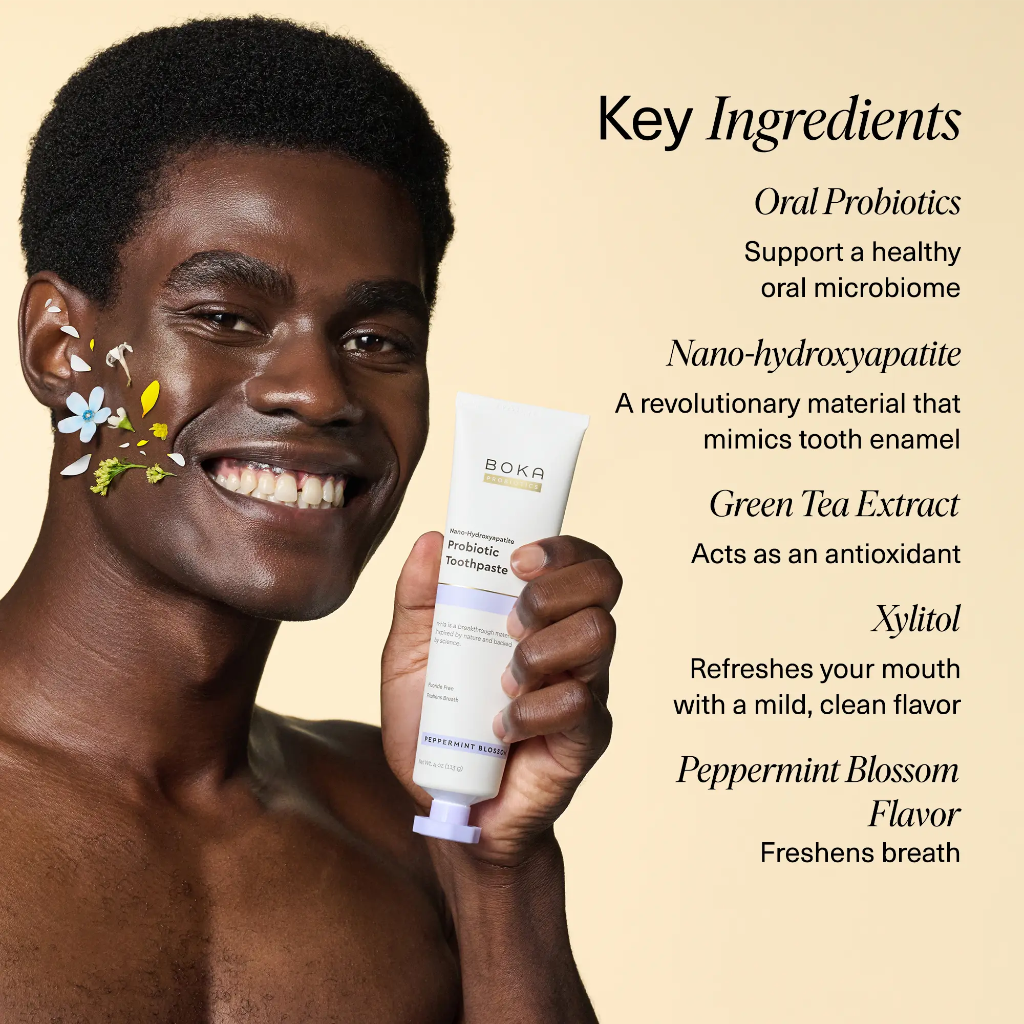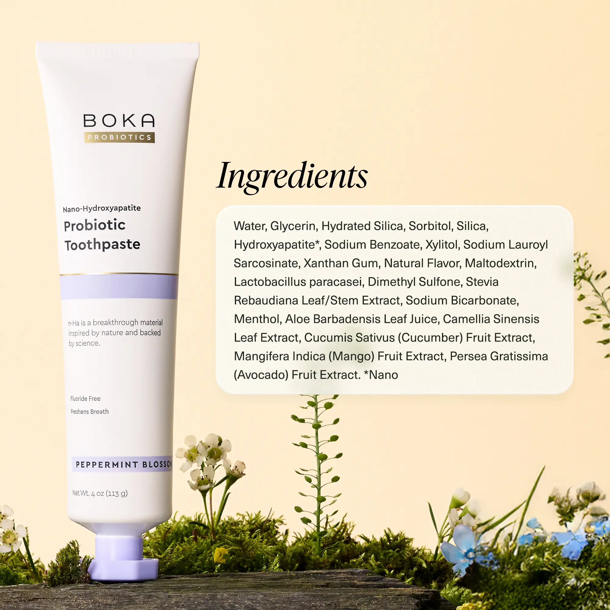 MIMICS TOOTH ENAMEL: Our proprietary and innovative formula includes Nano-hydroxyapatite (n-Ha) - a biomimetic mineral form of the same ingredient that naturally makes up 97% of your teeth material and 70% of your dentin. n-Ha has been the subject of significant research for decades with a wide variety of potential benefits across dentistry and oral care. PROBIOTIC POWER FOR ORAL WELLNESS: Boka nano hydroxyapatite toothpaste is formulated with clinically researched Dental-Lac probiotics, to support the oral microbiome. Ideal dental probiotics for women, probiotic for men, and anyone seeking a healthier smile. BIOCOMPATIBLE: Free from Fluoride, Sulfates, Parabens & Artificial Flavors & Colors - we meticulously crafted our product to be biocompatible, ensuring it’s safe for daily use and non-toxic when used as directed. A perfect way to deliver oral probiotics for teeth and gums and take your oral hygiene routine to the next level! APPROPRIATE FOR SENSITIVE TEETH: Gentle yet effective, Boka’s probiotic toothpaste provides a soothing and refreshing experience for the whole family. A fluoride free toothpaste kids and adults can rely on for clean oral care. PEPPERMINT BLOSSOM CALM: A soothing blend of peppermint and spearmint with subtle floral notes. This flavor leaves your mouth feeling fresh. A great choice for anyone looking for oral probiotics for mouth bad breath.