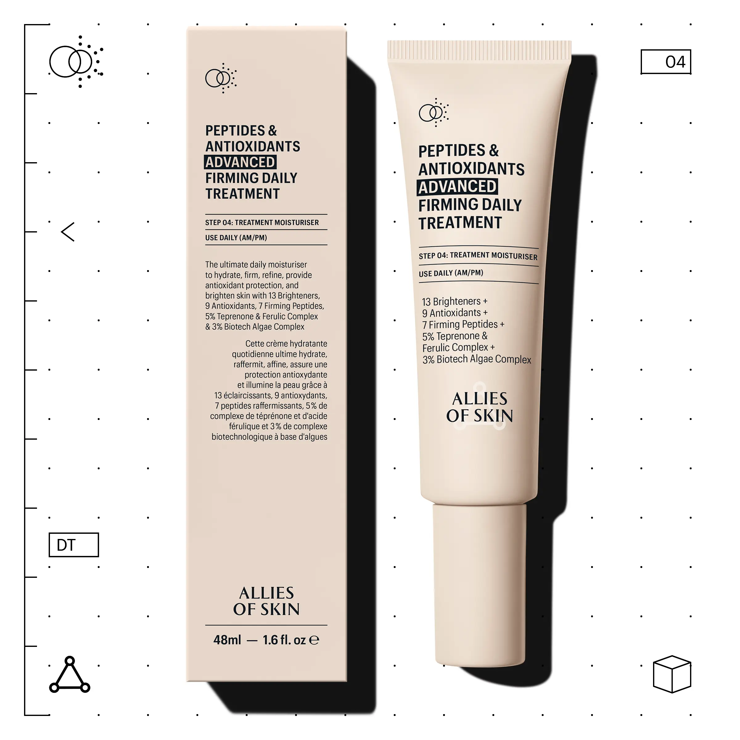 Ideal for both AM/PM use, this leave-on, all-day advanced moisturizer is a 5-in-1 supercharged formula that combines the 5 key benefits that your skin needs into 1 bottle: hydration, firming, refining, antioxidant protection, and brightening. With the concentration of a treatment mask and the ease of a moisturizer, our award-winning blend features Key Allies such as 13 Brighteners, 9 Antioxidants, 7 Firming Peptides, a 5% Teprenone & Ferulic Complex and a 3% Biotech Algae Complex, that together, infuse skin with multiple benefits to reduce signs of aging.