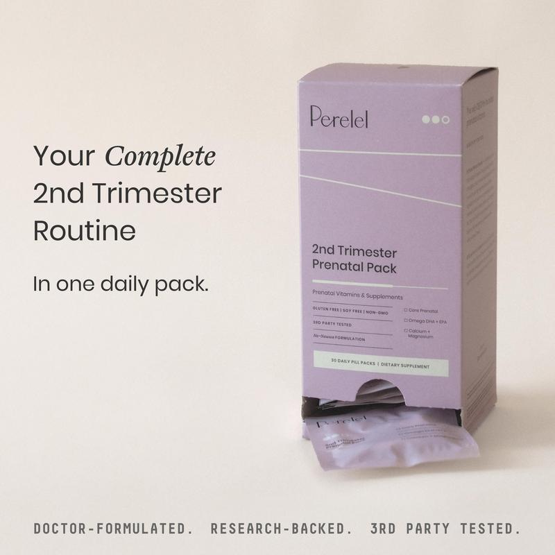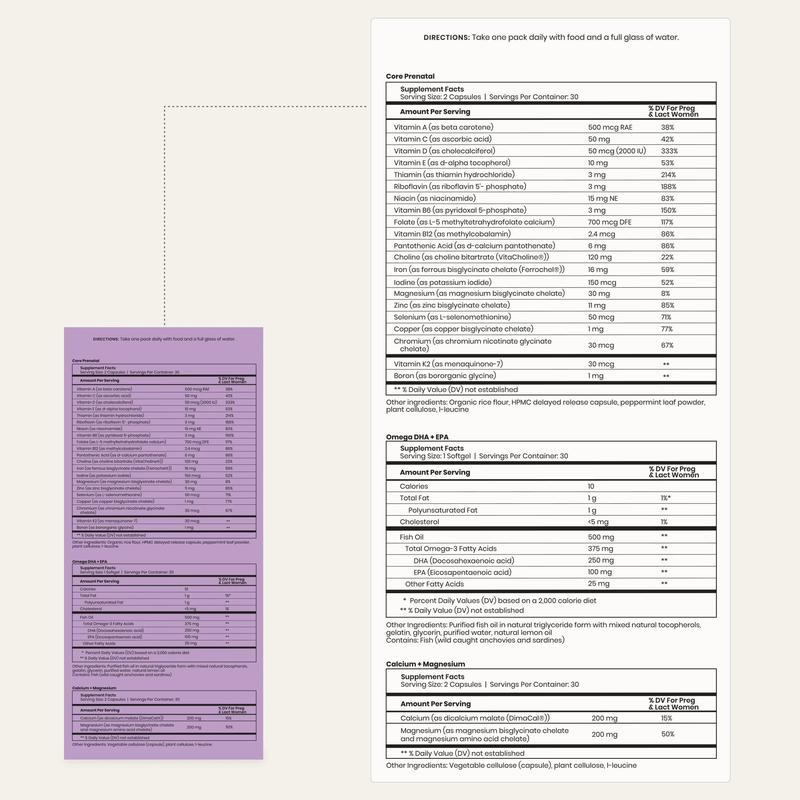 A complete daily prenatal vitamin routine for your 2nd trimester, designed by a team of leading OB/GYNs to support baby’s skeletal growth while easing muscle cramps.* Each daily pack includes a full-spectrum prenatal vitamin, omega DHA + EPA and additional calcium and magnesium, in no nausea formulations.
