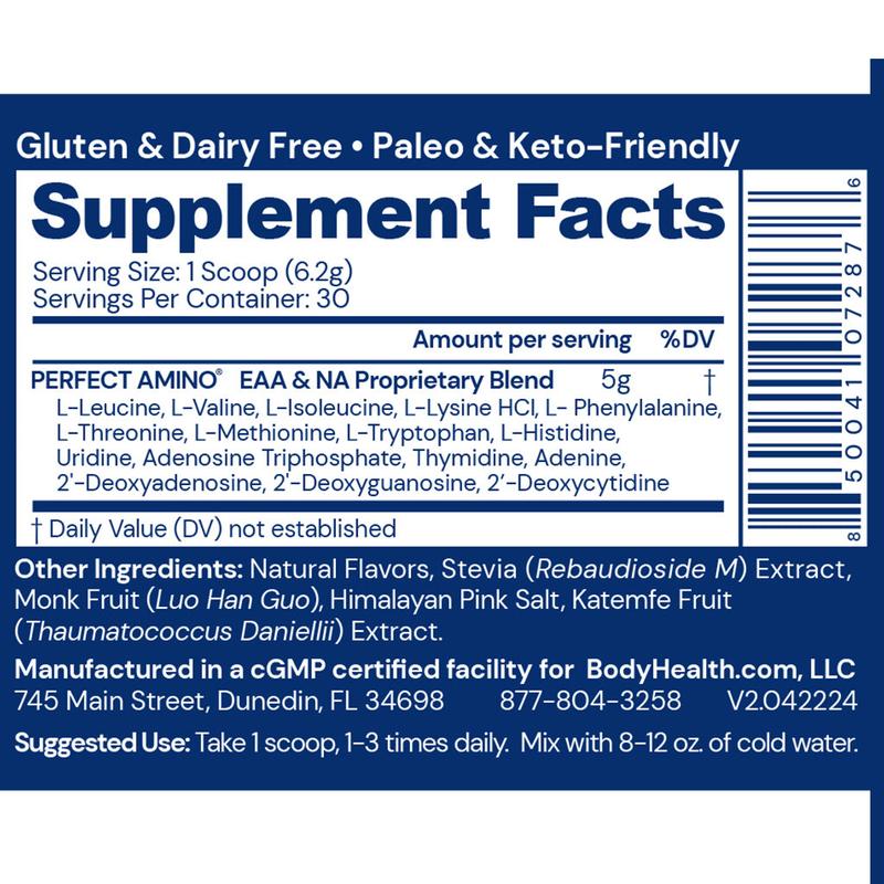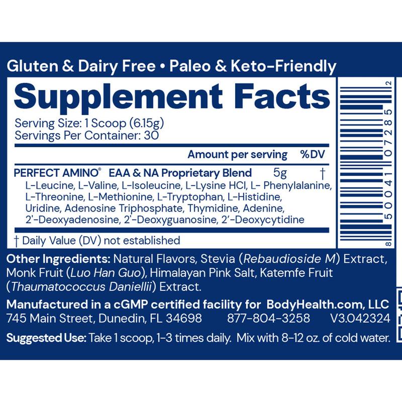 PerfectAmino Powder comes in various flavors: Strawberry, Mixed Berry, Lemon Lime, Mocha, Chocolate, Vanilla, and an Unflavored option. It's 100% Vegan/Vegetarian, Free of Gluten, Soy, Dairy, Sugar, Toxins, and MSG. It contains no artificial sweeteners. Choose your favorite flavor for optimal recovery and health benefits.