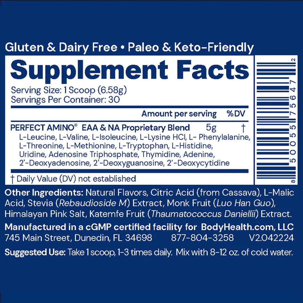 PerfectAmino is pure essential amino acids in a precise form and ratio. It's up to 99% utilized by the body to build new protein, muscle, and collagen. One serving provides the protein-building equivalent of 30g of whey or collagen, without the caloric impact. It helps build lean muscle, not excess body fat.