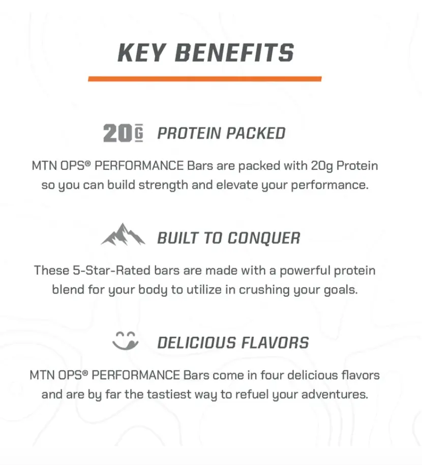 ABOUT MTN OPS Performance Bars are built to Conquer More, featuring 10 Bars per box with 20 grams of blended protein including whey isolate, whey concentrate, and collagen per bar. 4 grams or less in added sugar and top-notch flavor, our bars are gluten-free and adventure-ready. Enjoy a MTN OPS Performance Bar whenever you need a protein-filled snack.