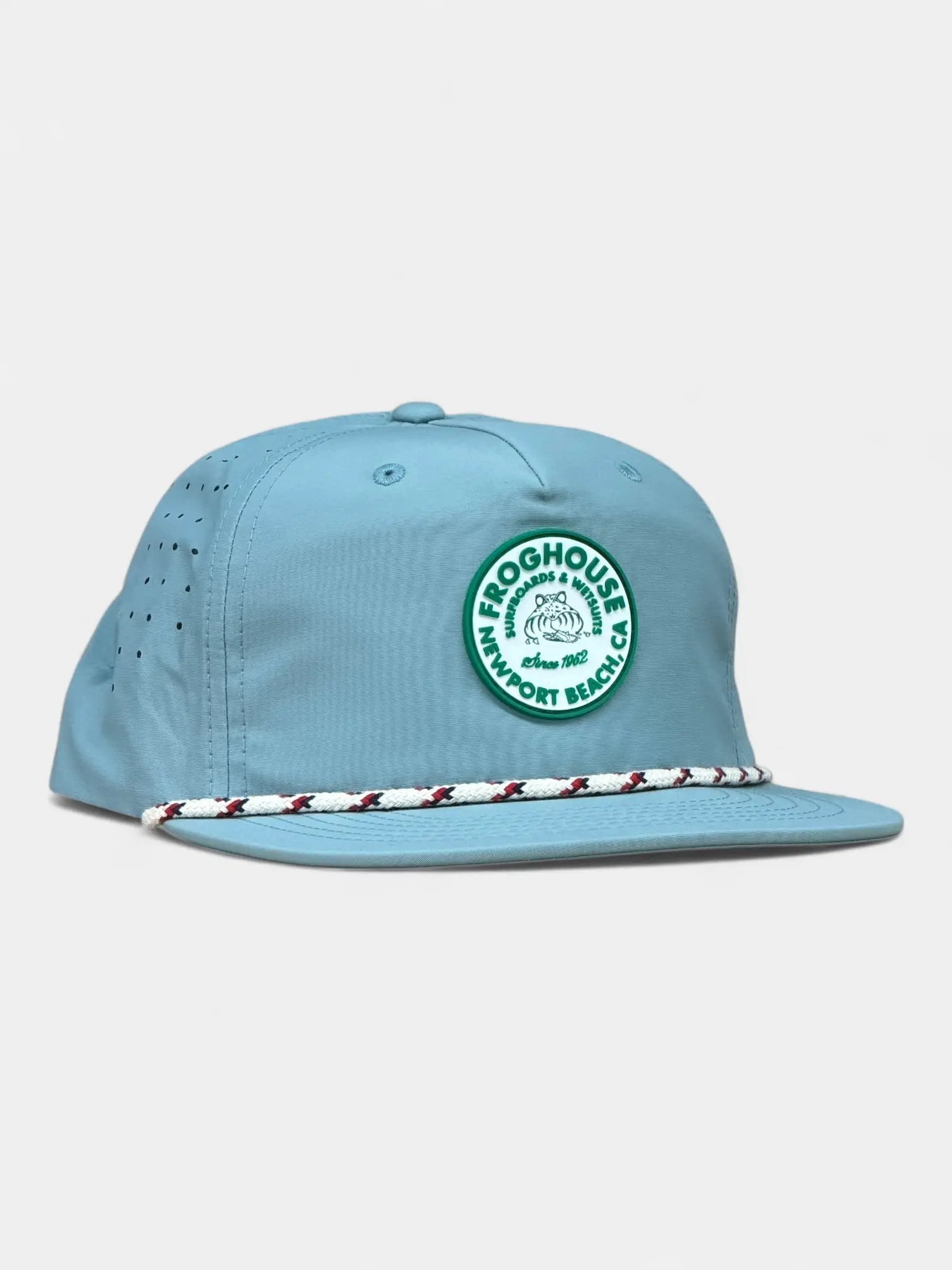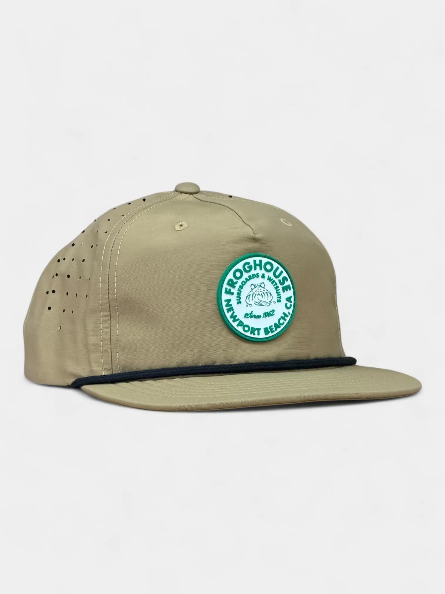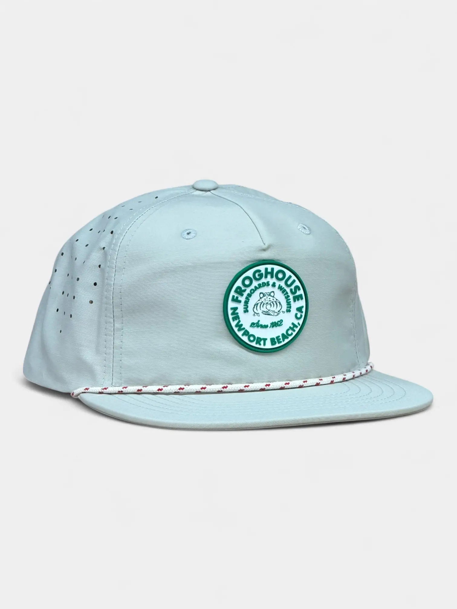 A Custom Performance, Grandpa Structured, Pinch Front 5 Panel, Soft Packable Flat Bill with 5mm Rope Detail, Moisture Management Premium Sweatband and Classic Snapback. Waterproof.