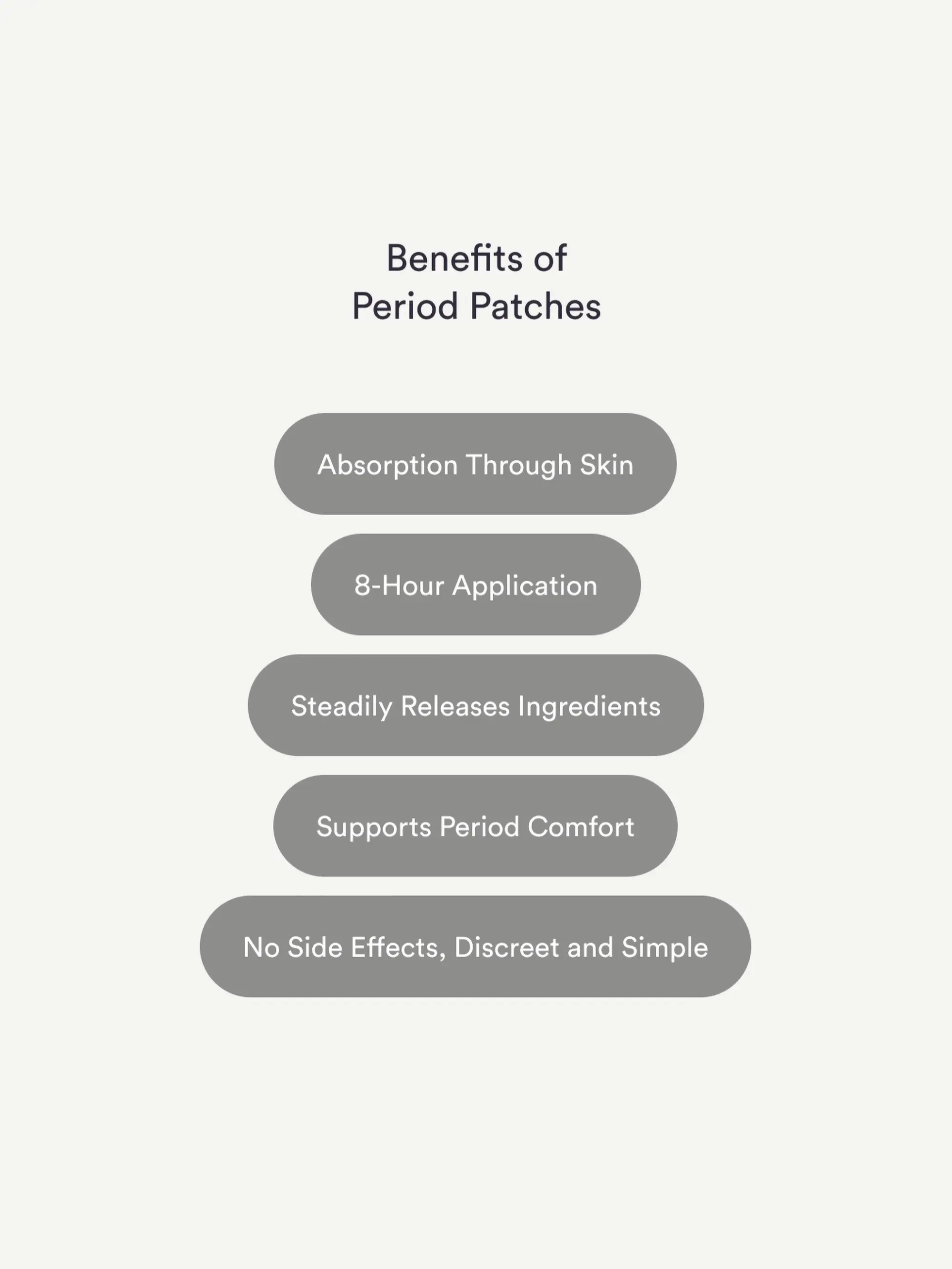 Our Period Patches are crafted with natural ingredients and designed for gradual, lasting comfort during your cycle. Thoughtfully made to support your well-being, these patches offer an easy way to feel at ease throughout the day.