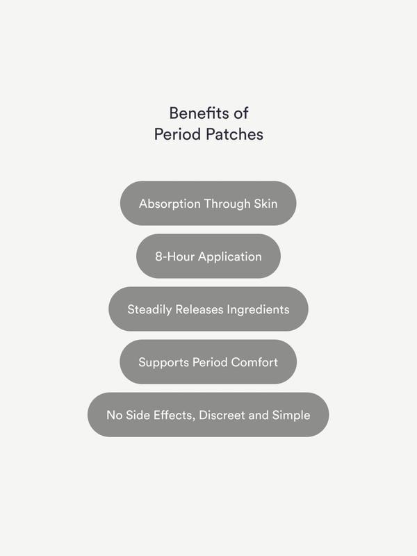 Period Patches: Experience soothing relief and comfort with our Period Patches. Infused with a carefully selected blend of essential vitamins, minerals, and nutrients, these patches are designed to provide comfort during your cycle and support overall well-being. Our innovative formula helps you feel more balanced.