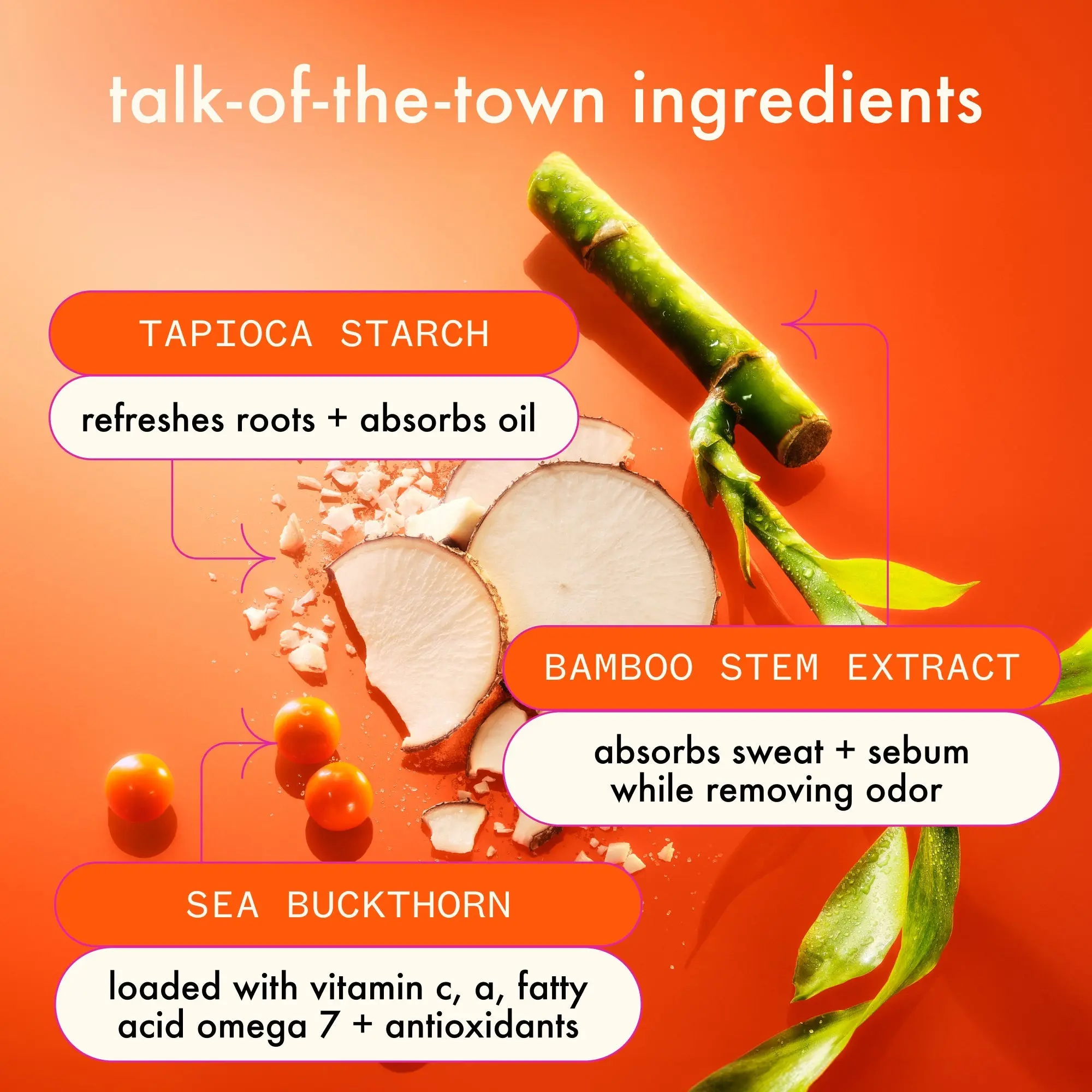 - revitalizes greasy strands courtesy of root-friendly ingredients like oil-absorbing tapioca starch, odor-- removing bamboo stem extract + our signature superfruit sea buckthorn.