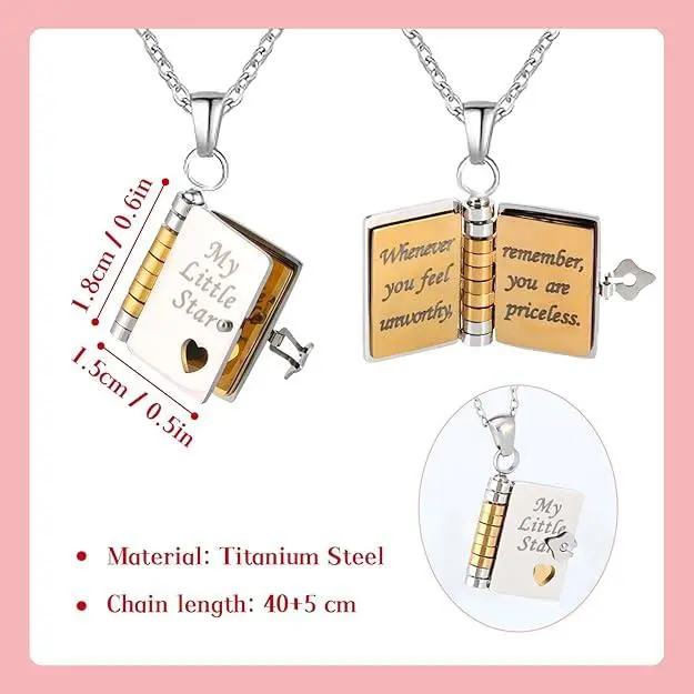 My Little Star Book Necklace Personalized Gift for Your Daughter This necklace is a unique gift for your incredible daughter. It features an openable book design with 6 pages of engraved information. Perfect for birthdays or graduation, it's a heartfelt jewelry piece of love. The book necklace allows your daughter to cherish special moments with meaningful messages. Features of the Necklace Openable book design with 6 pages. Engraved with personal messages. Ideal for birthdays and graduations. A symbol of love and appreciation for your daughter. A Touch of Love This necklace is more than just jewelry; it's a token of love. It holds cherished memories and special notes, making it a memorable gift. Show your love and gratitude with this beautifully crafted book necklace.
