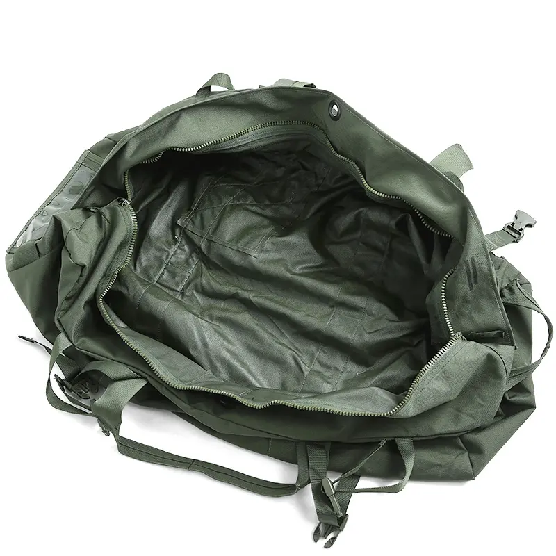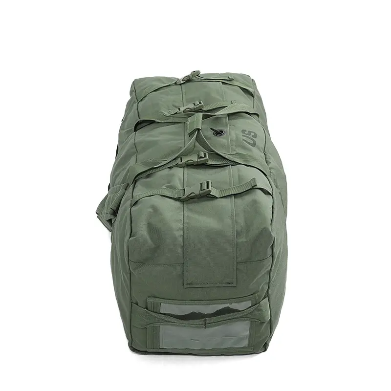 Material-nylon duck, plain weave; color-dyed camouflage green 483; single item; non-sized; two heavy duty slide fasteners with locking sliders that meet in the middle of the bag opening; four compression straps, two side carrying handles, two top closing handles and shoulder straps with a buckle for adjustment; clear plastic pocket is attached to the top side of the bag to accommodate shipping documents; loop piece of fastener sewn inside the pocket for attaching a name-tape; bag can be securely locked by attaching a padlock through a retainer.
