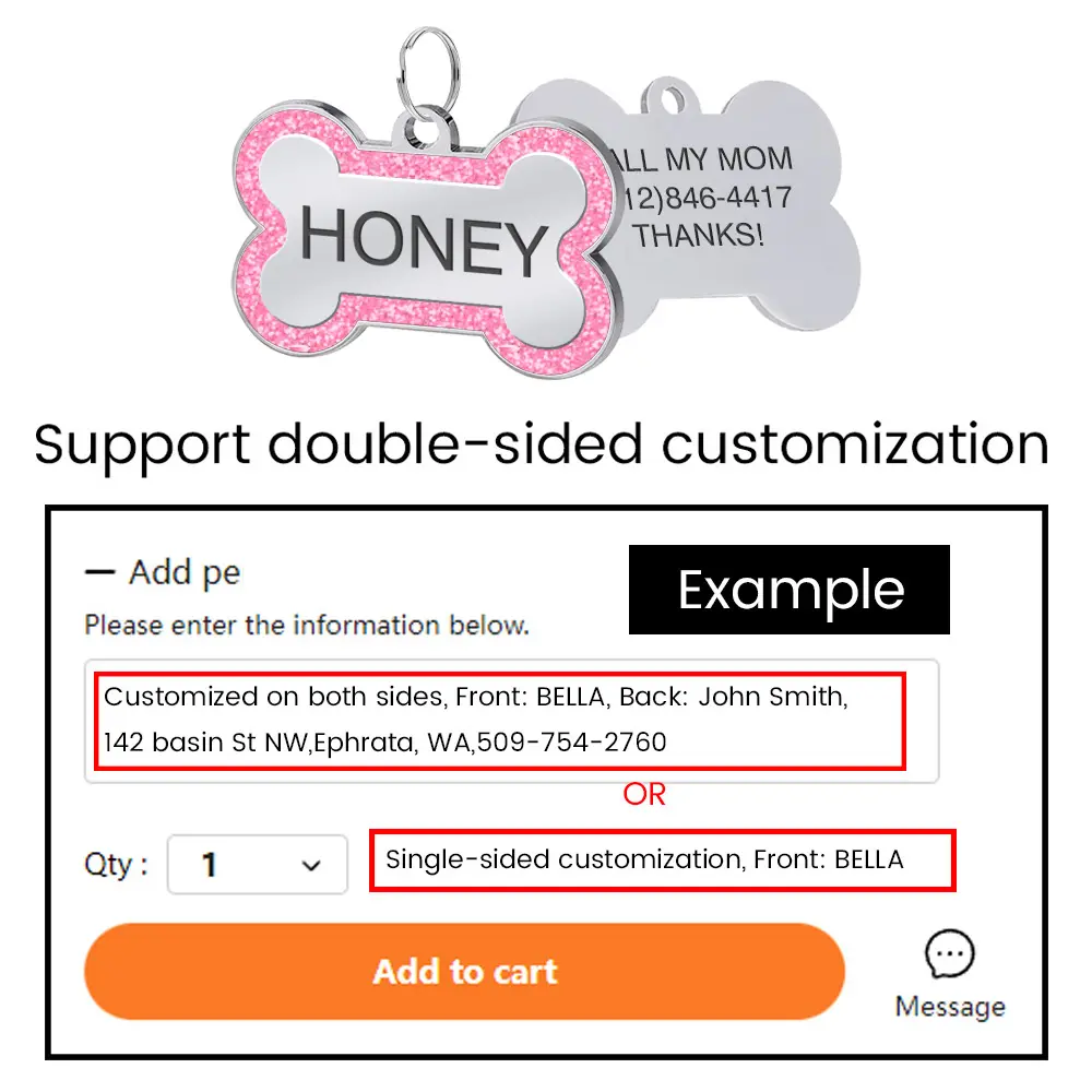 If you would like to customize a unique nameplate for your pet, please be sure to provide accurate customization information when placing an order. To ensure successful customization, you can choose any of the following methods: