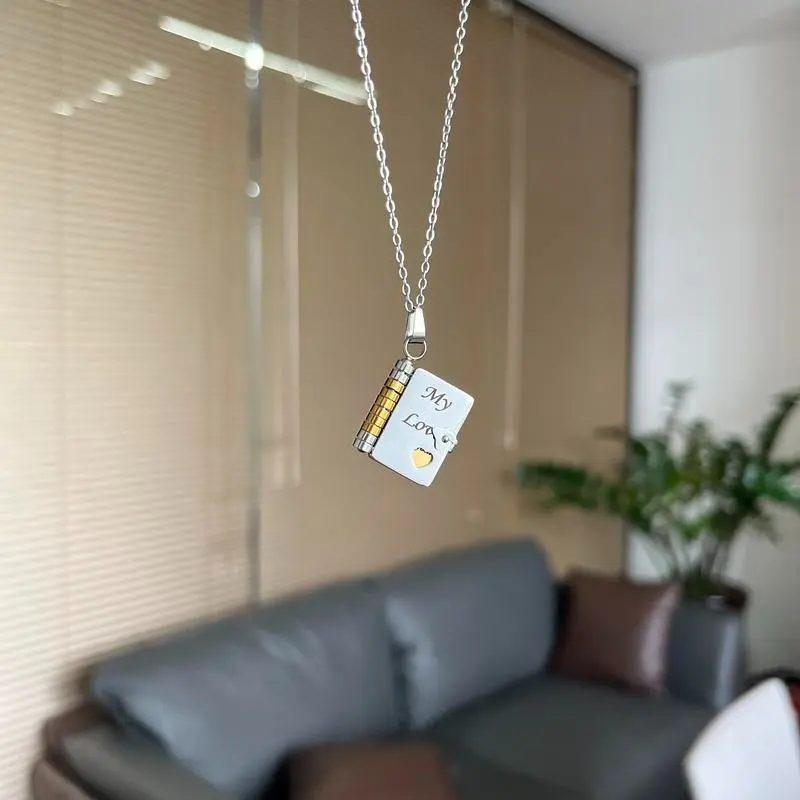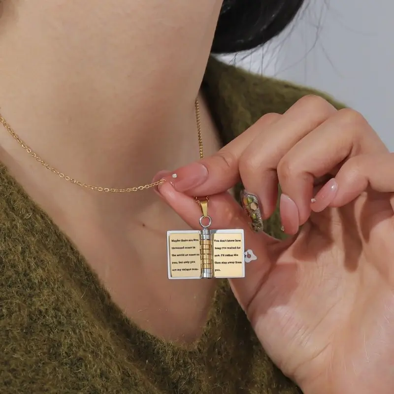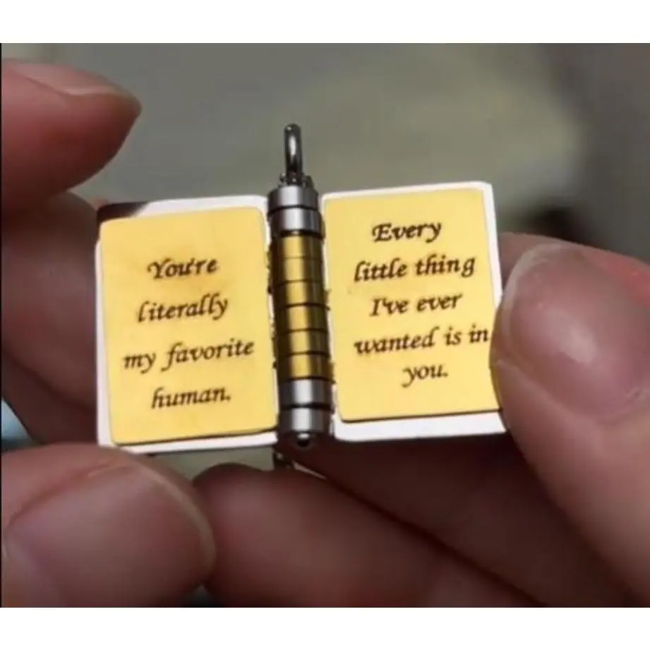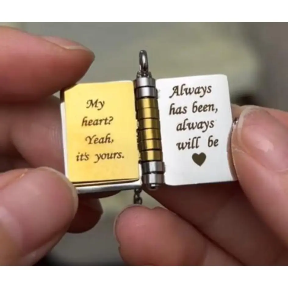 【Necklace for Love】: My incredible love book necklace — A genuine six-page flip-through jewelry book. Each page is exquisitely engraved with your most heartfelt words—far more than precious jewelry, it's a wearable token of love that transforms every page turn into a tender conversation of love.
