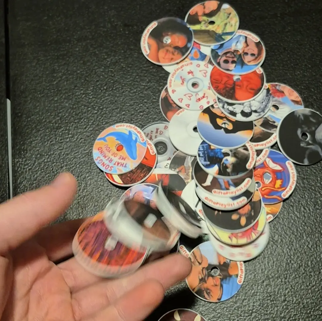 Our viral tap-to-play CD keychain receives these disks and opens your playlist instantly! Works with Spotify and Apple Music. Perfect gift for music lovers.