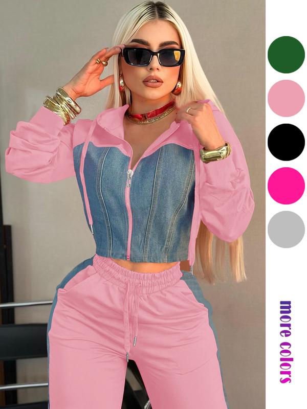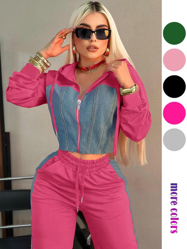 Personalized Patchwork Hoodie Set, Long Sleeve Short Top Set, Casual Party, Travel Pants Set, Fashionable Streetwear