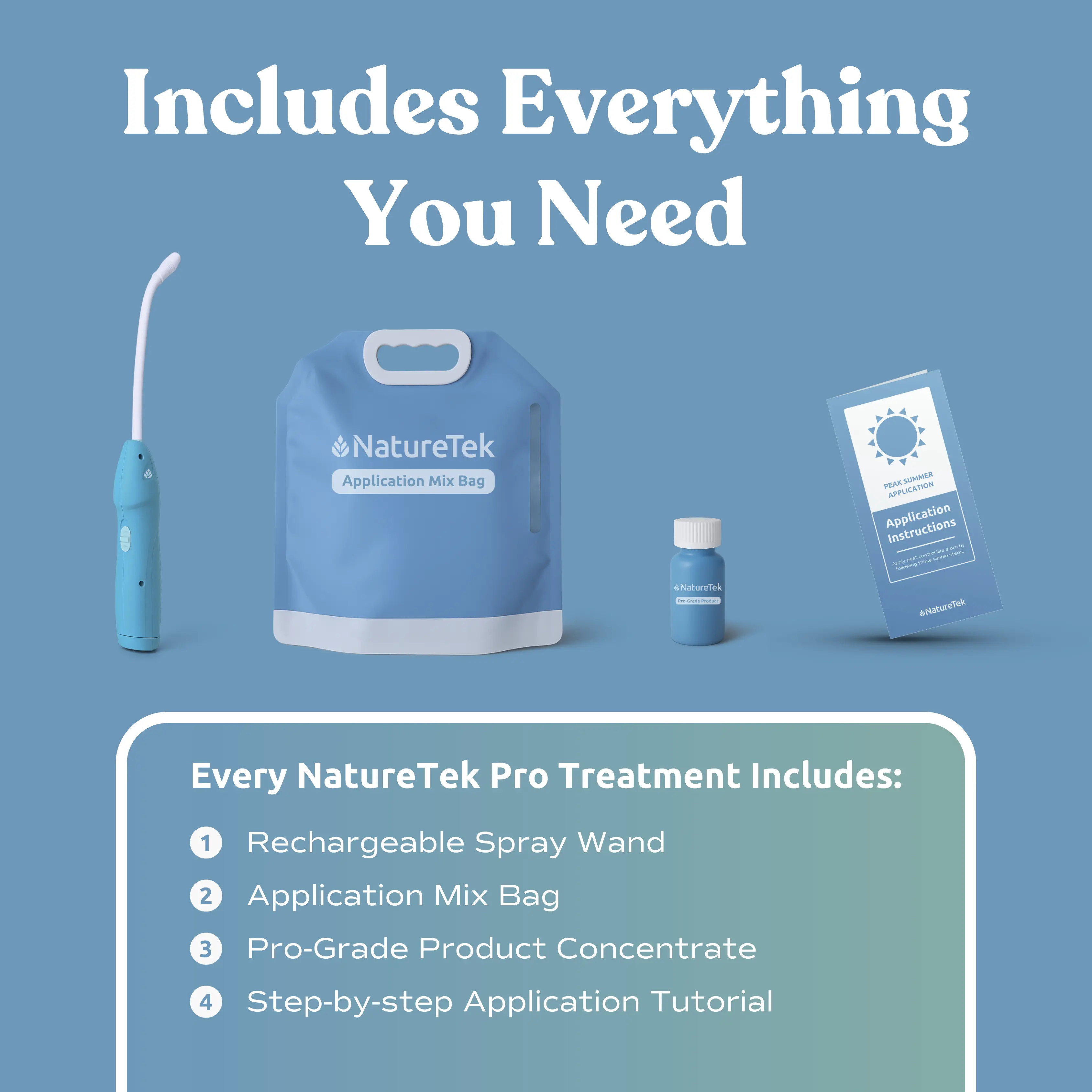 Our all-in-one package come with everything you need to treat right in the box, including an electric spray wand, a mix bag, safety gloves, step-by-step instructions and pro-grade pest control product itself.