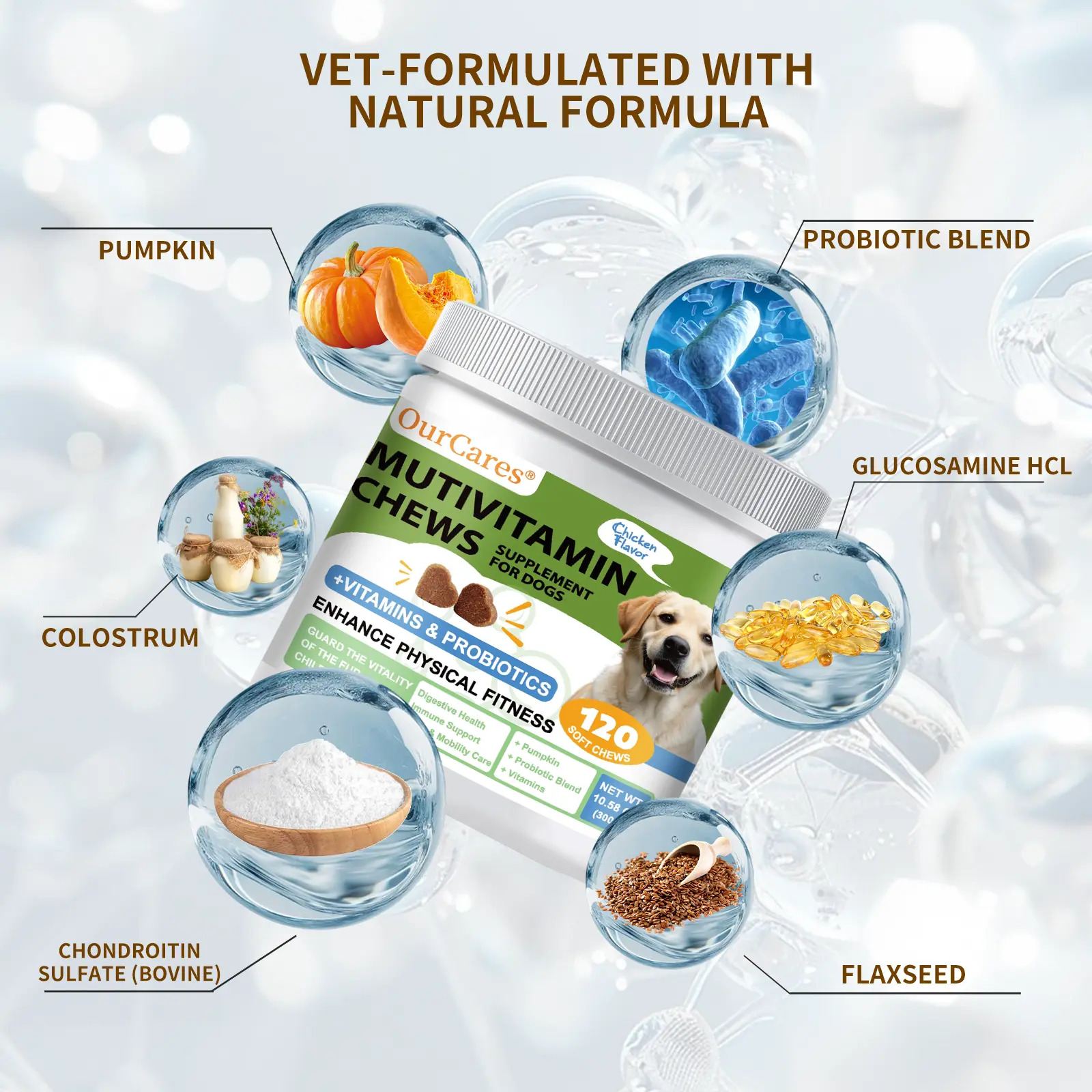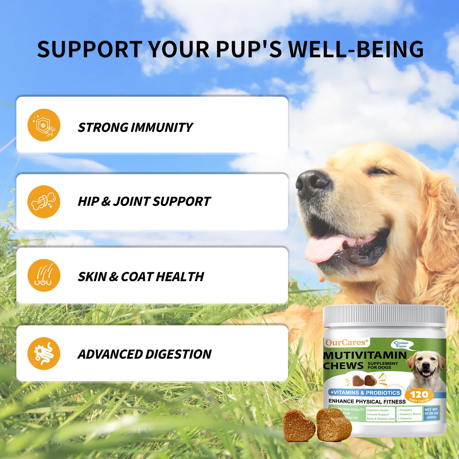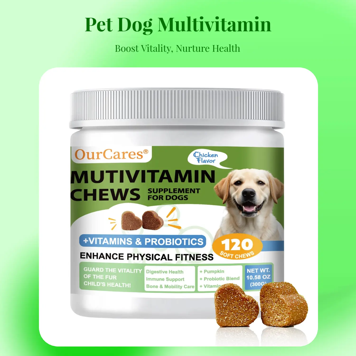 Specially designed vitamin chewable tablets for pets, made from natural ingredients, scientifically formulated with yeast, lecithin, spirulina, taurine, lutein, and various vitamins and minerals to comprehensively meet the nutritional needs of pet growth.Unique processing techniques preserve active ingredients, helping to boost immunity, promote bone development, and maintain skin and coat health, keeping pets full of vitality.Free from artificial coloring, flavoring, and preservatives, it is safe and secure to take on a daily basis.Choose our Pet Vitamin Chewable Tablets to provide personalized nutritional care for your furry friends, helping them grow up healthy and happy, and enjoy a life of happiness!
