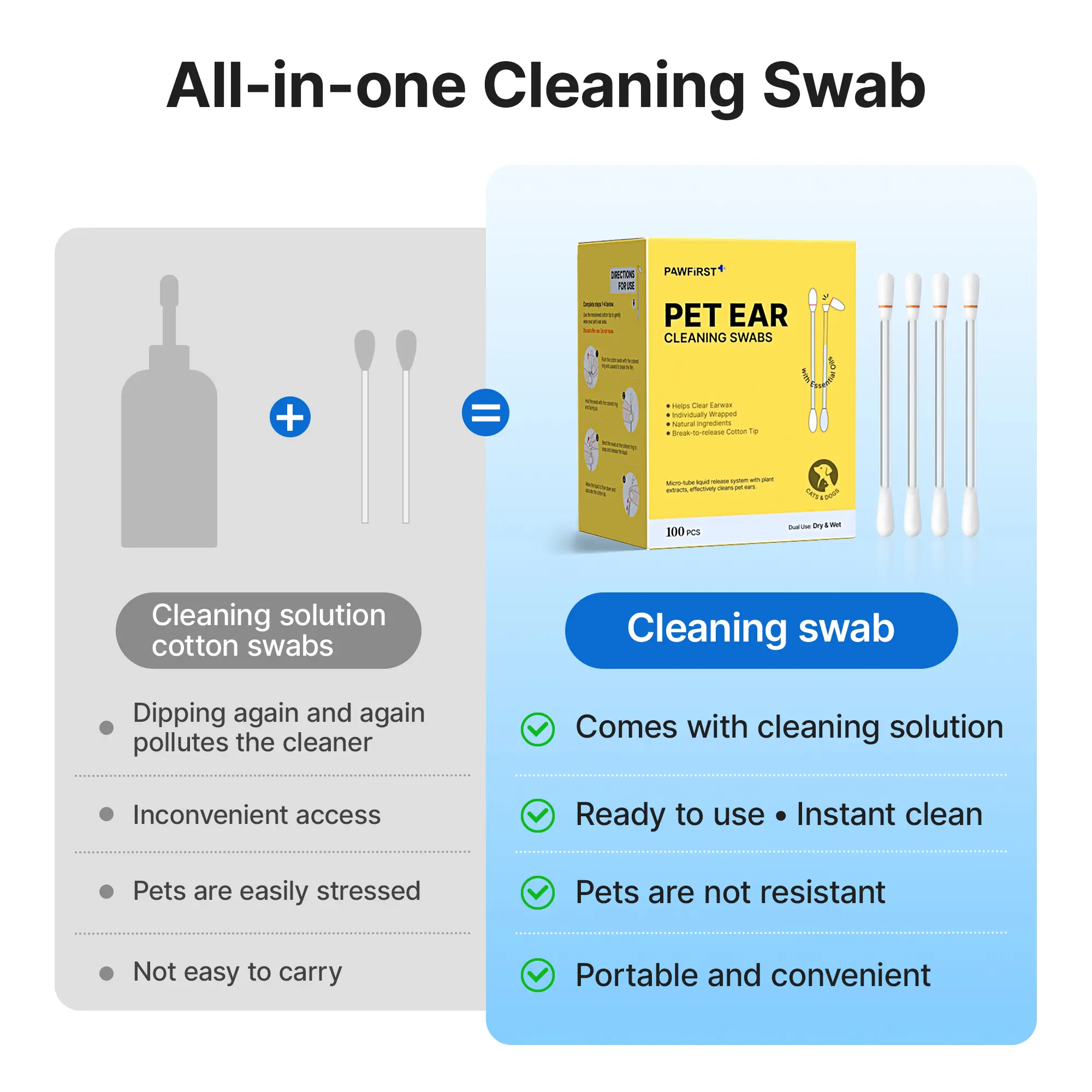 Comes with 100 individually wrapped swabs in a sturdy storage box – hygienic and easy to store. Just break let liquid saturate the tip gently wipe the outer ear and canal entrance (do not insert deeply). For cats & dogs; external use only. If irritation persists, consult a veterinarian.