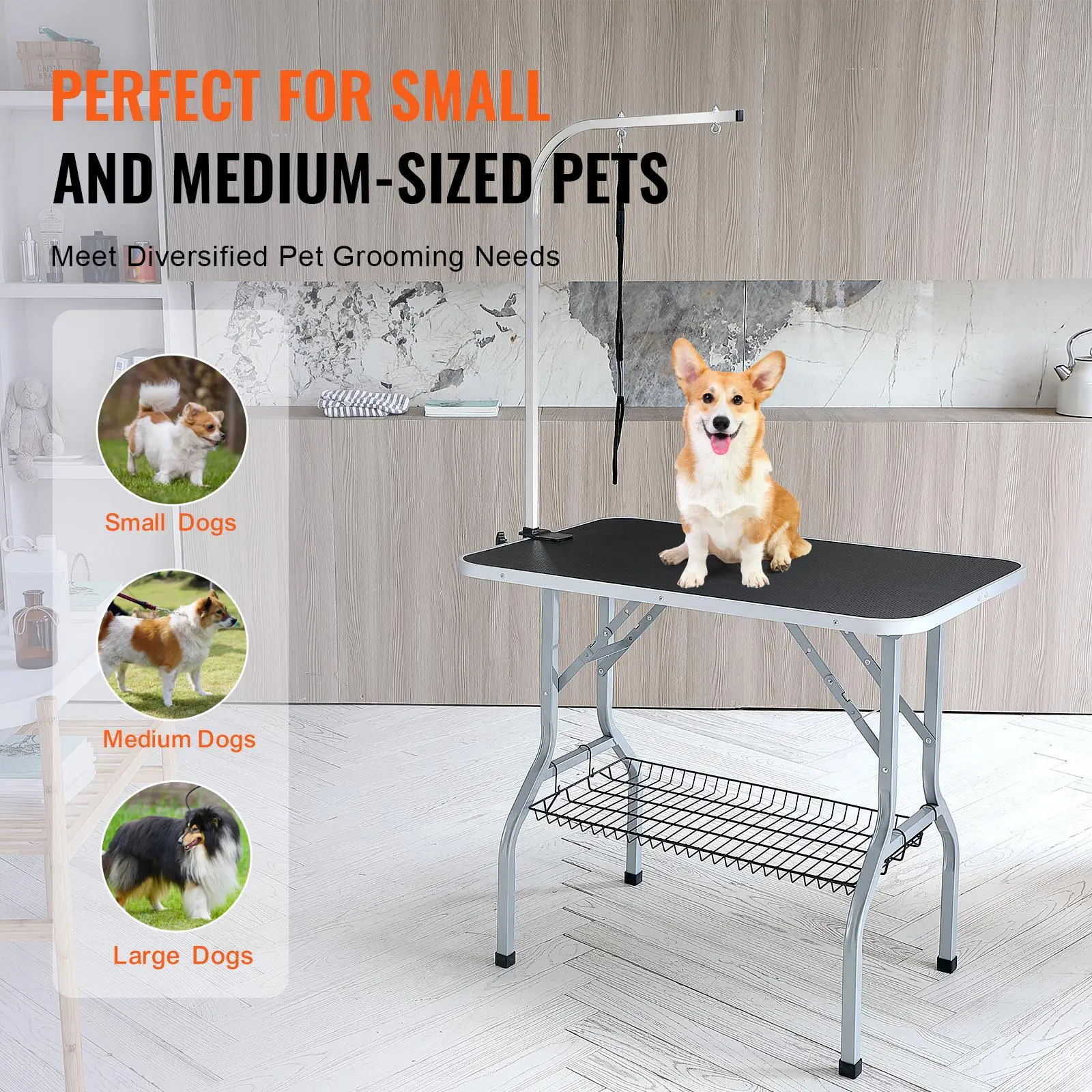 • Convenient and Thoughtful Details: The anti-bend support frame is foldable and sturdy, preventing bending. Dual dog leashes ensure pets are safely restrained. The 31.5" elevated legs reduce bending, and non-slip, heat-resistant rubber foot pads provide stability even on smooth floors. Additionally, a storage shelf accommodates leashes, toys, brushes, clippers, and other grooming supplies and accessories.