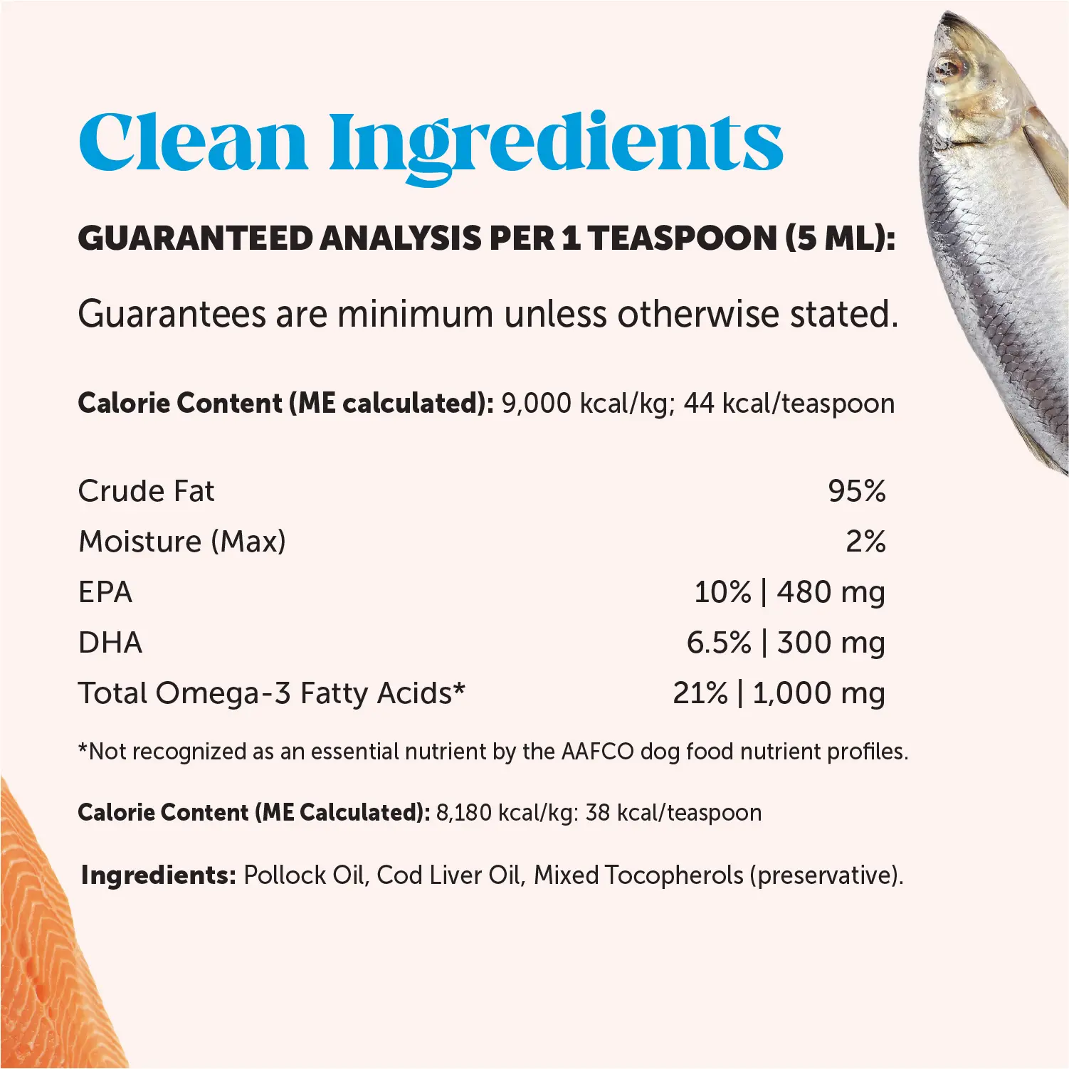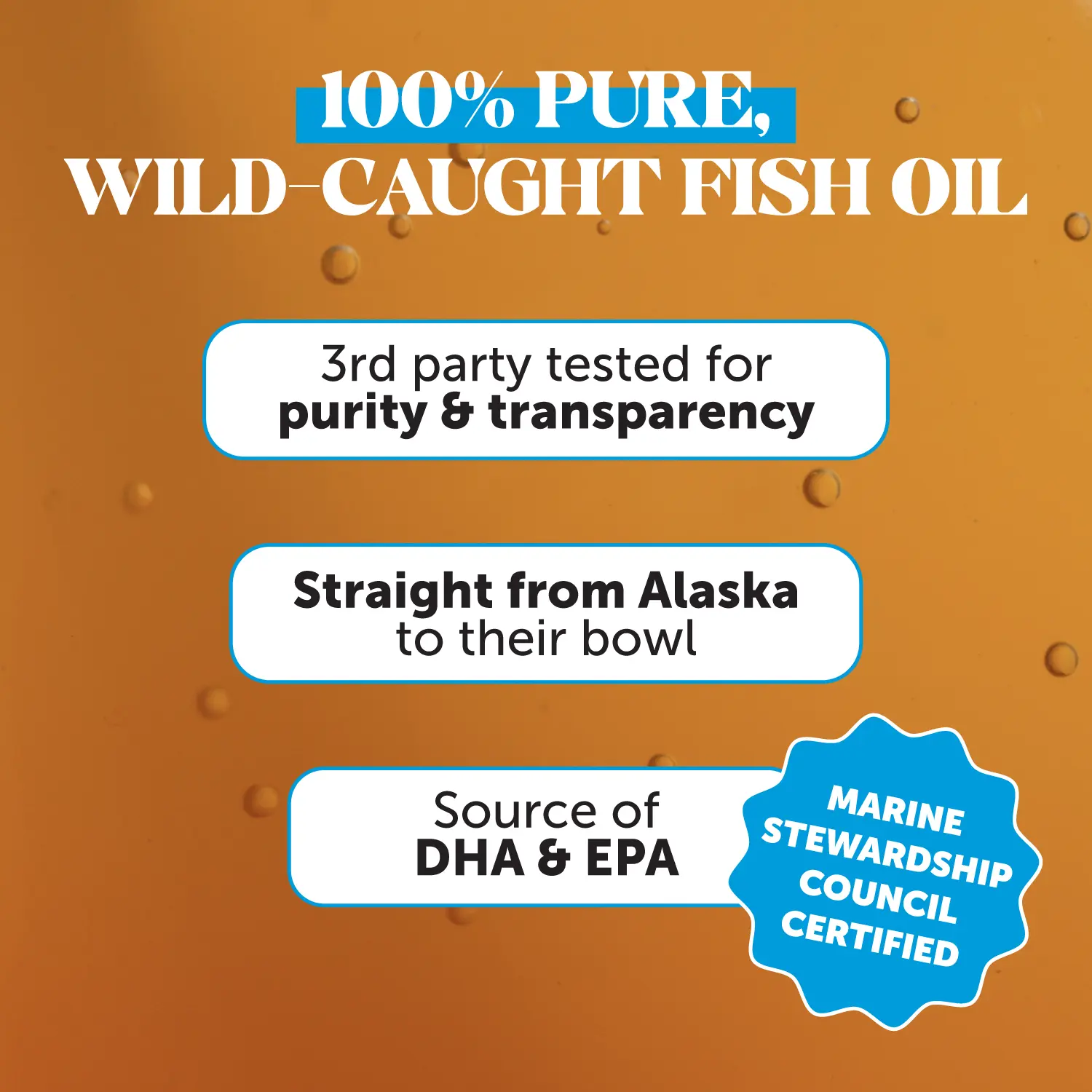 One serving contains 800mg of EPA and 525mg of DHA. It addresses stiff joints, shedding, and irritated skin. The oil is naturally purified to remove fishy odor and taste.