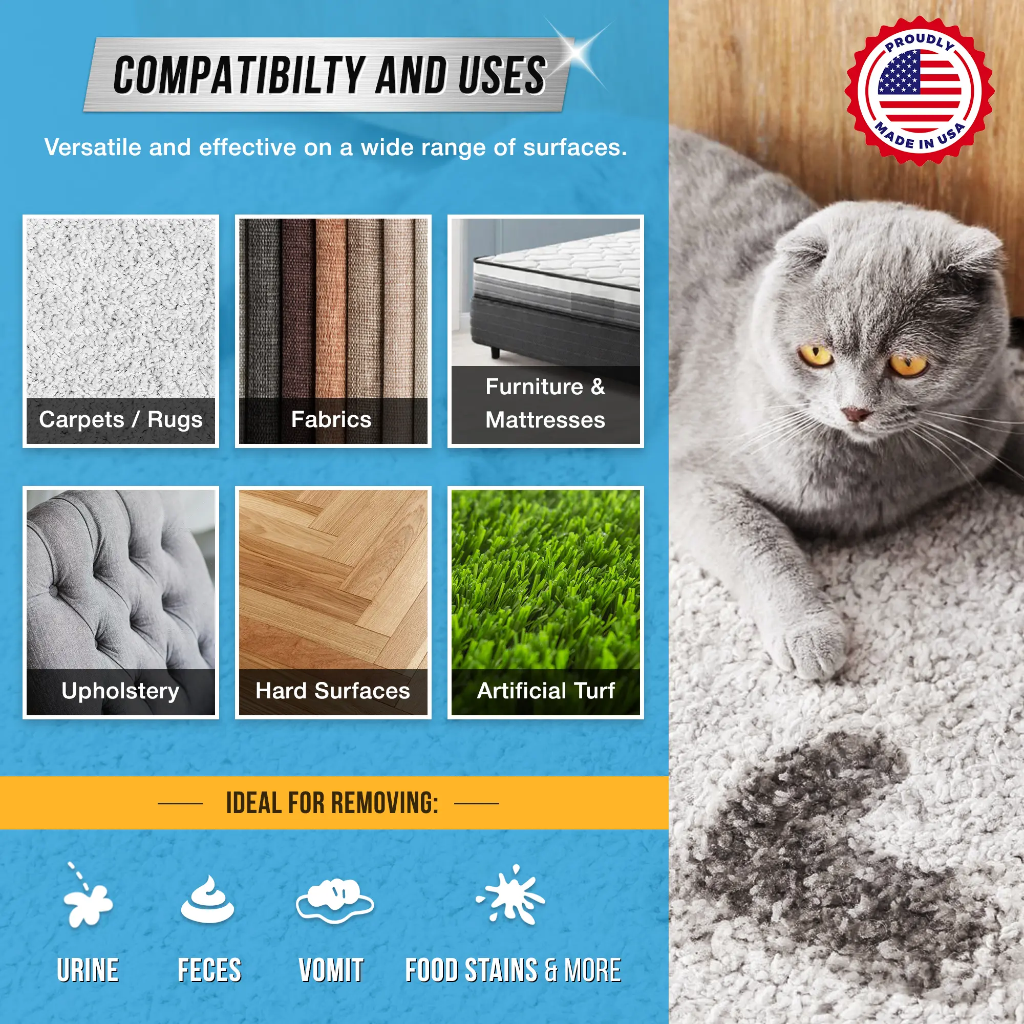 ·Designed for Home Surfaces: Universal Indoor Pet Clean-up Spray for couch stains, Wood Floors, Rug, Furniture, Mattress, Dog bed, Kennel- wherever your pet goes! Get any hard to clean accident in the house with ACTIVE deodorizers and animal stain removers