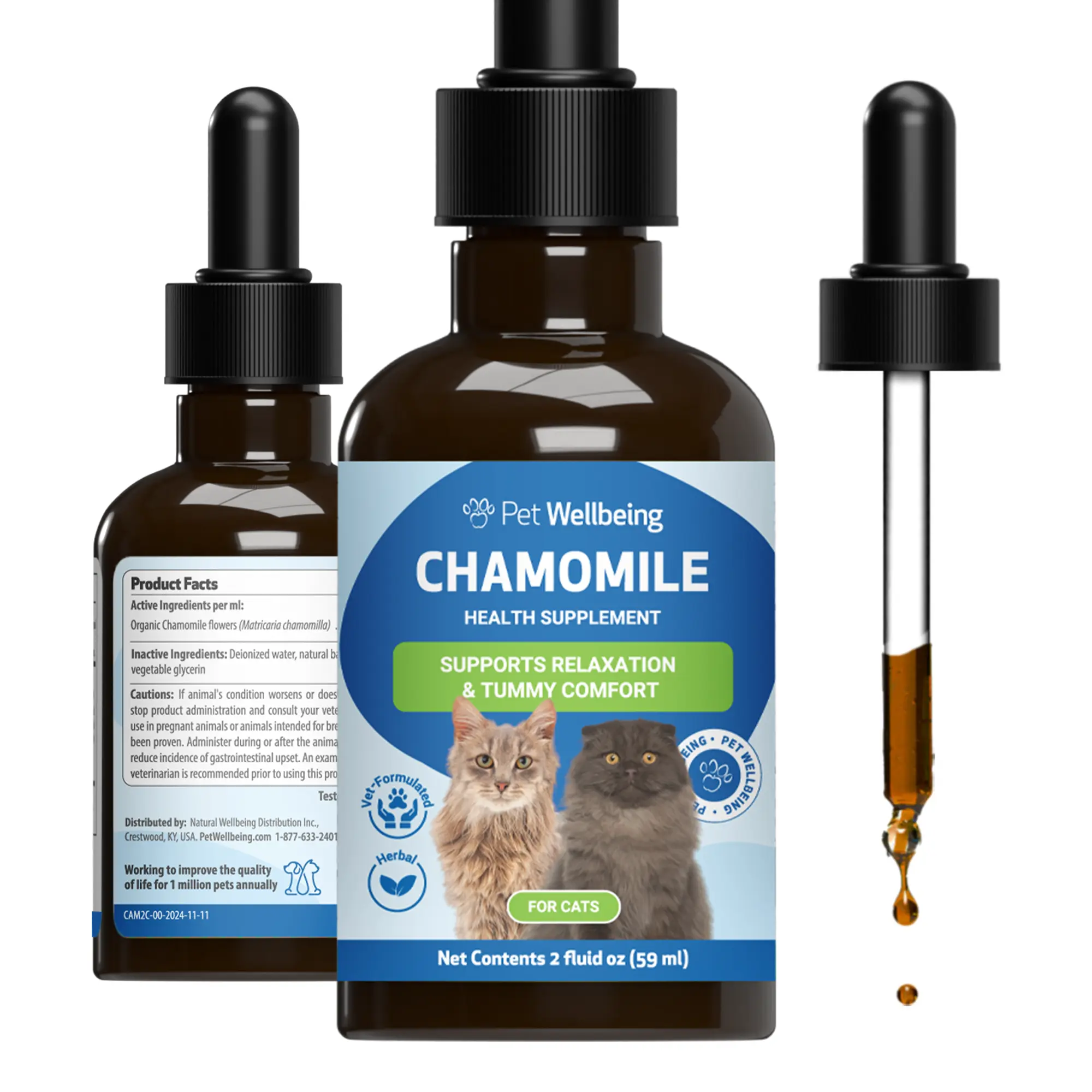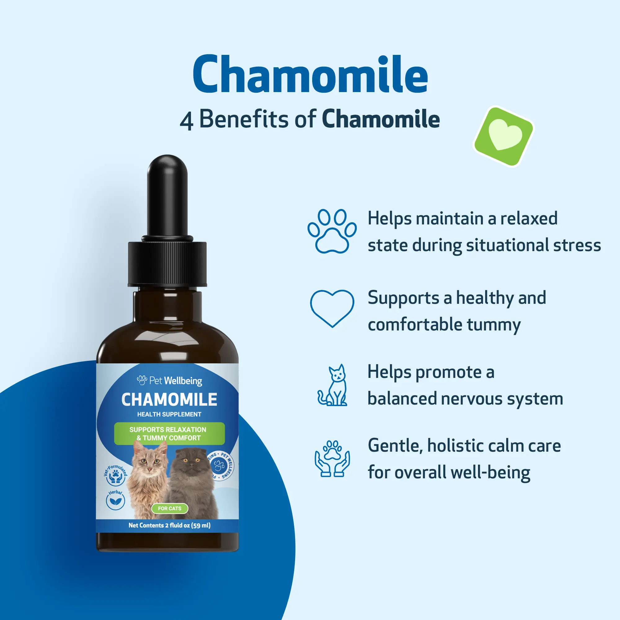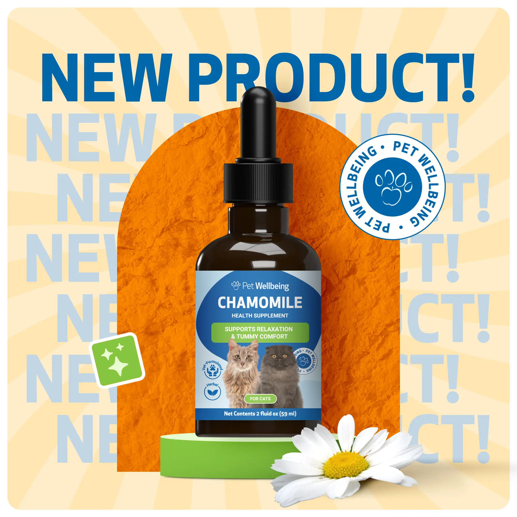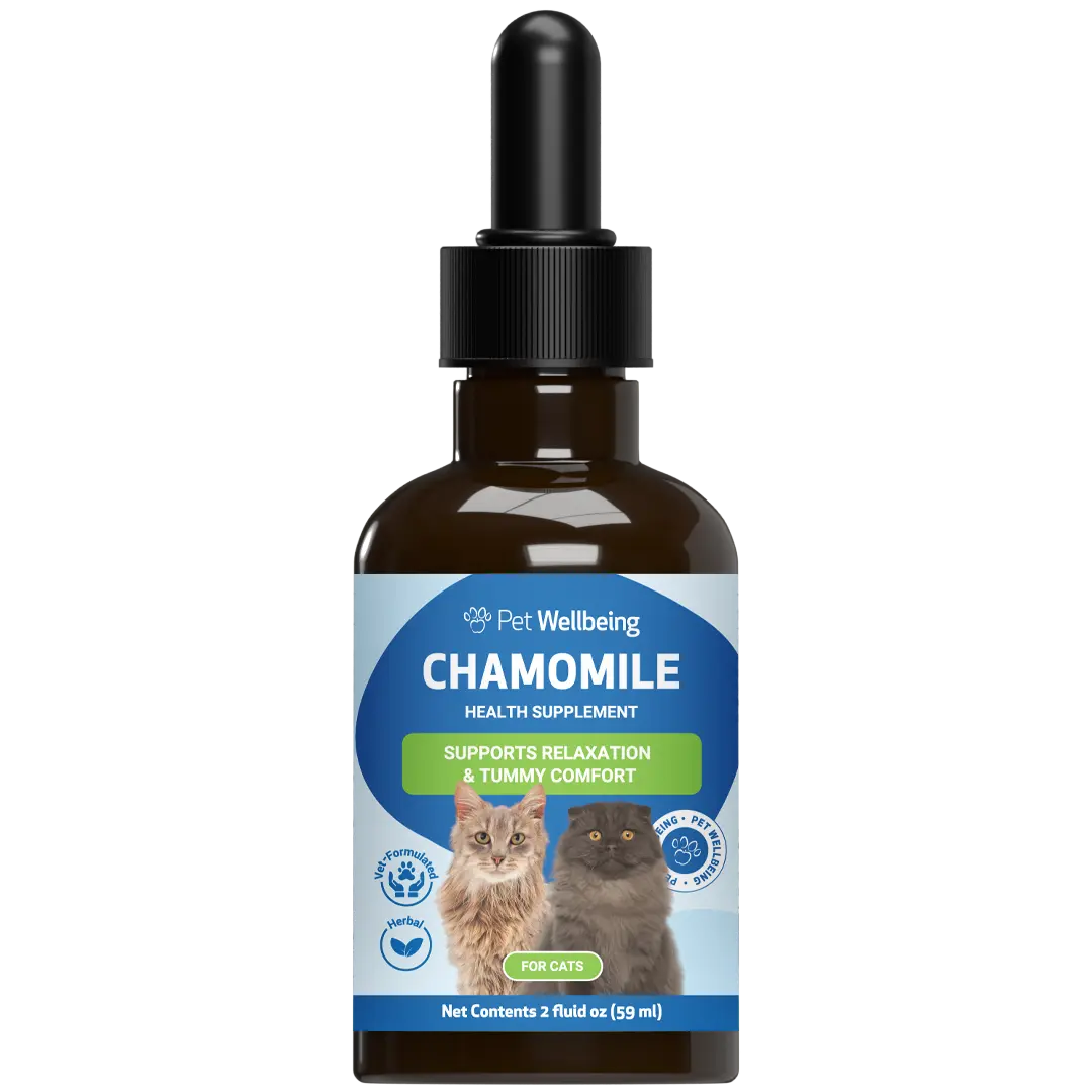 Chamomile is well-tolerated by most cats, but in rare cases, some may have sensitivities to plants in the Asteraceae family (such as ragweed, asters, and chrysanthemums). If your cat shows signs of an adverse reaction, discontinue use immediately and contact your veterinarian. Concerns about Chamomile’s safety in cats often stem from essential oils or improperly prepared extracts—Pet Wellbeing’s Chamomile supplement is not an essential oil and is carefully formulated for safe use when given as directed.