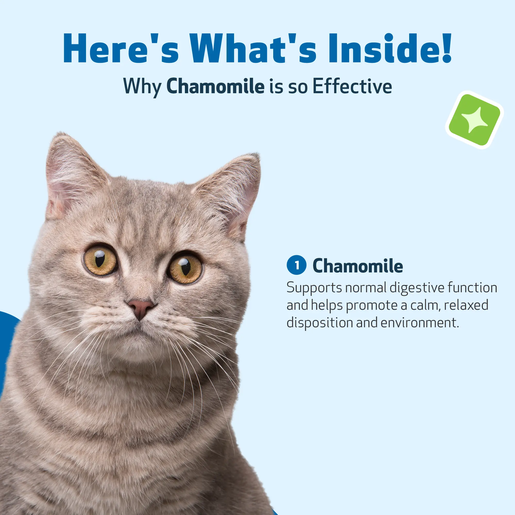German Chamomile is traditionally known for its comforting qualities, offering soft, holistic support when cats experience occasional digestive discomfort or situational stress. Whether your cat needs gentle digestive support for a balanced tummy or a moment of tranquility in response to occasional stressors, Chamomile provides a time-honored herbal approach. Traditionally brewed into teas and infusions, Chamomile has been used for centuries to help promote relaxation and help maintain normal digestive function. Now, it’s available in an easy-to-use supplement, helping your cat enjoy each day with ease and contentment.