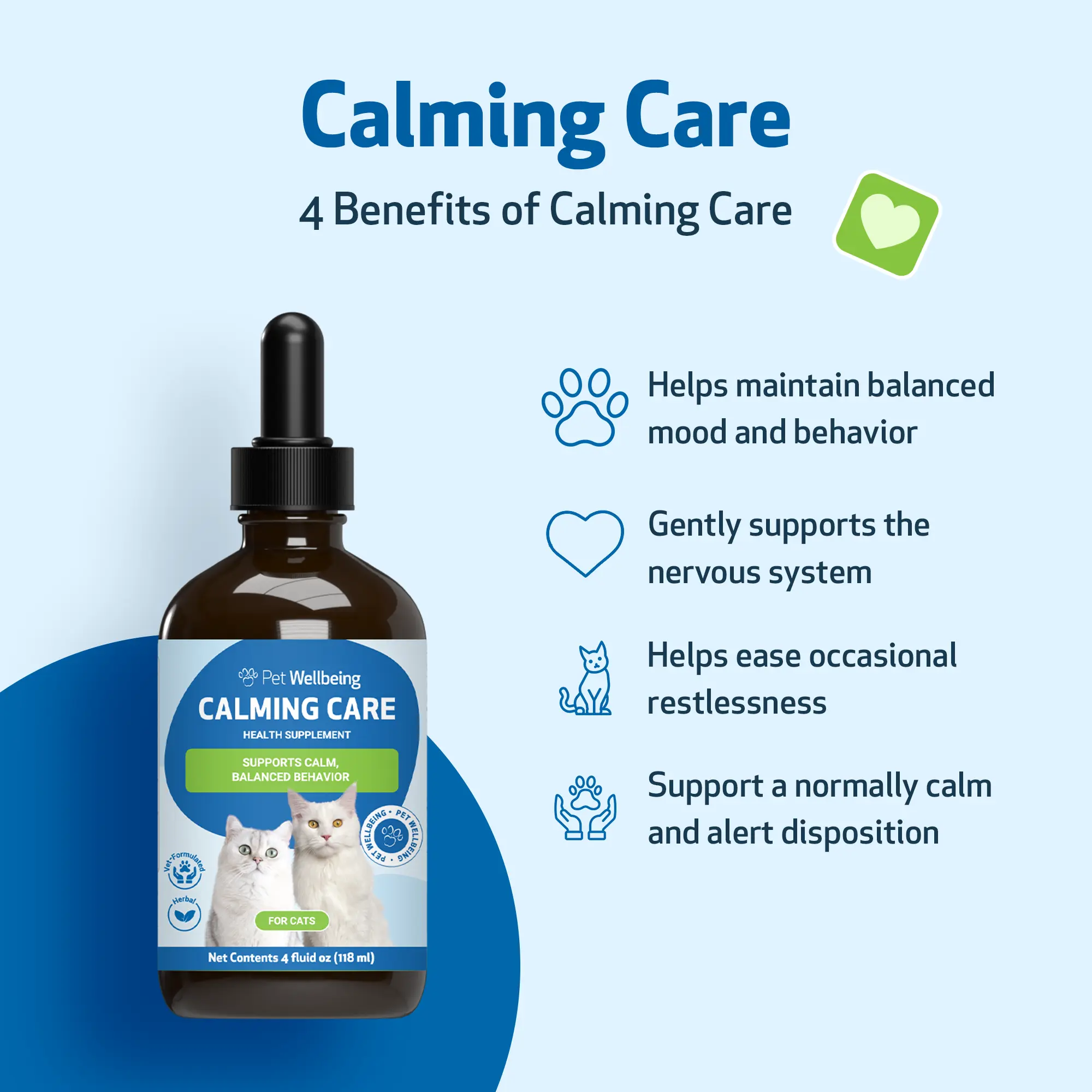 Calming Care is a veterinarian-formulated harmonious blend of herbs designed to help promote a relaxed and healthy nervous system in cats. This formula combines adaptogens and nervines, herbs traditionally used to support emotional balance and maintain a balanced stress response. Whether your cat faces occasional restlessness or normal environmental stressors like separation, travel, or routine changes, Calming Care supports a sense of calm and well-being while helping to promote a content disposition.