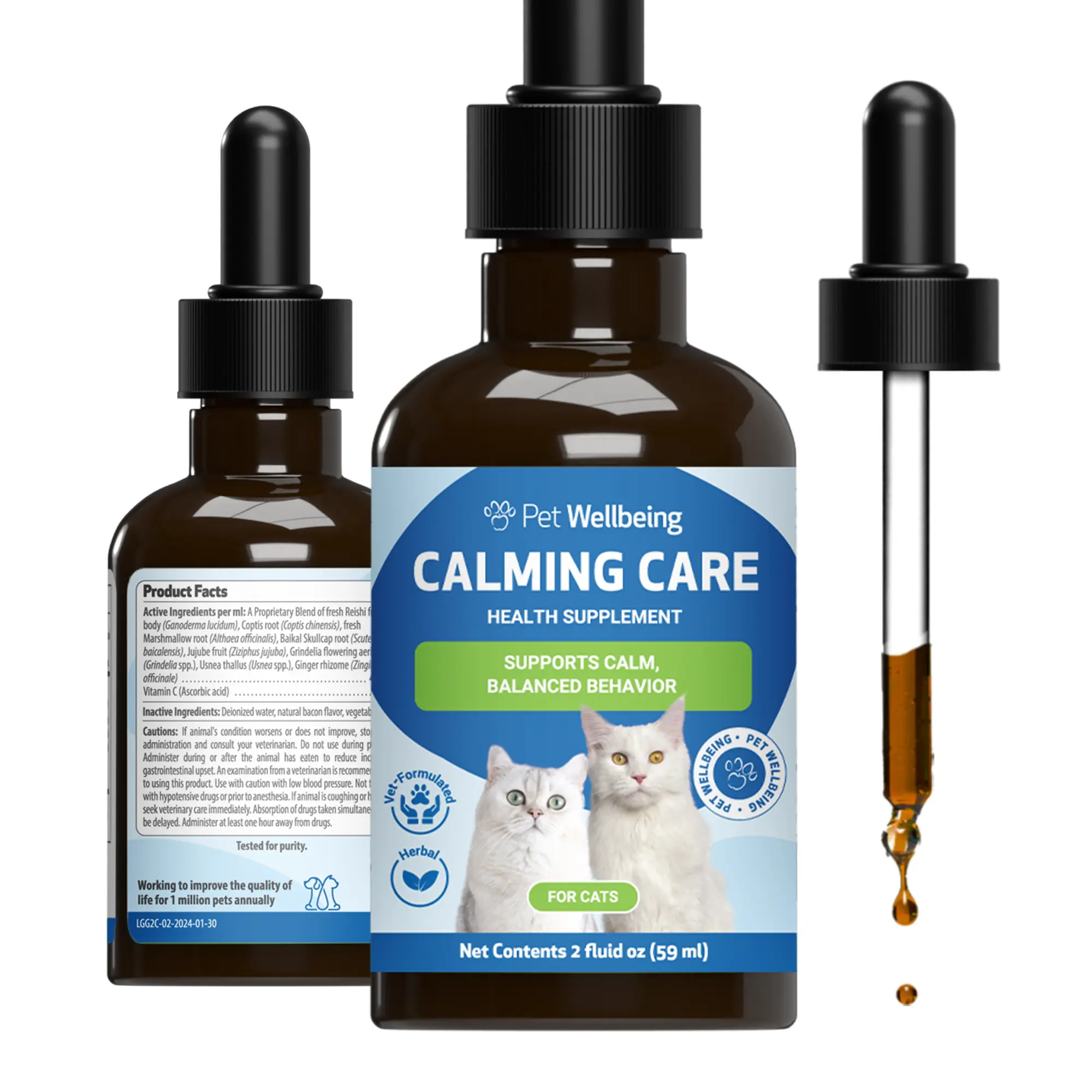 Calming Care was formulated to help support your cat’s ability to handle stress and maintain calmness during occasional challenging situations. The adaptogens and nervines in this blend synergistically work together to support the nervous system, helping to promote relaxation and balanced behavior. Over time, Calming Care holistically helps your cat maintain a sense of contentment and supports occasional restlessness, contributing to an overall improved quality of life. This high-quality supplement is an excellent choice for helping your feline friend navigate life’s changes with ease, helping promote a naturally calm and alert state.