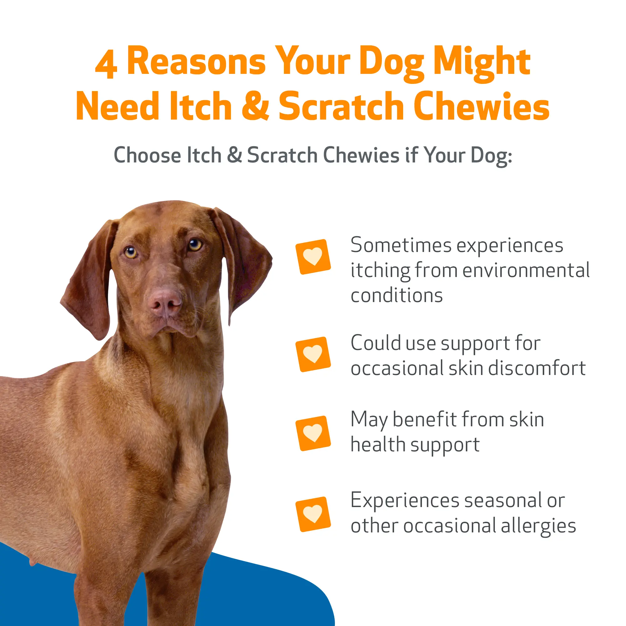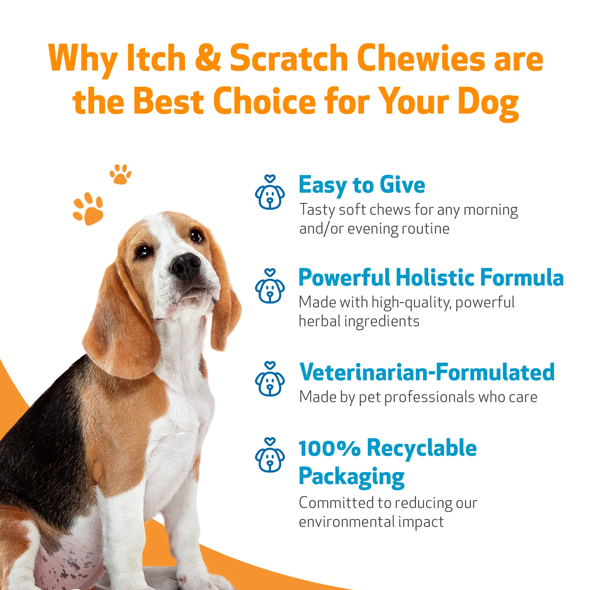 If your dog is experiencing hot spots, itching, scratching, or itchy paws and legs, Itch & Scratch Chewies can help!