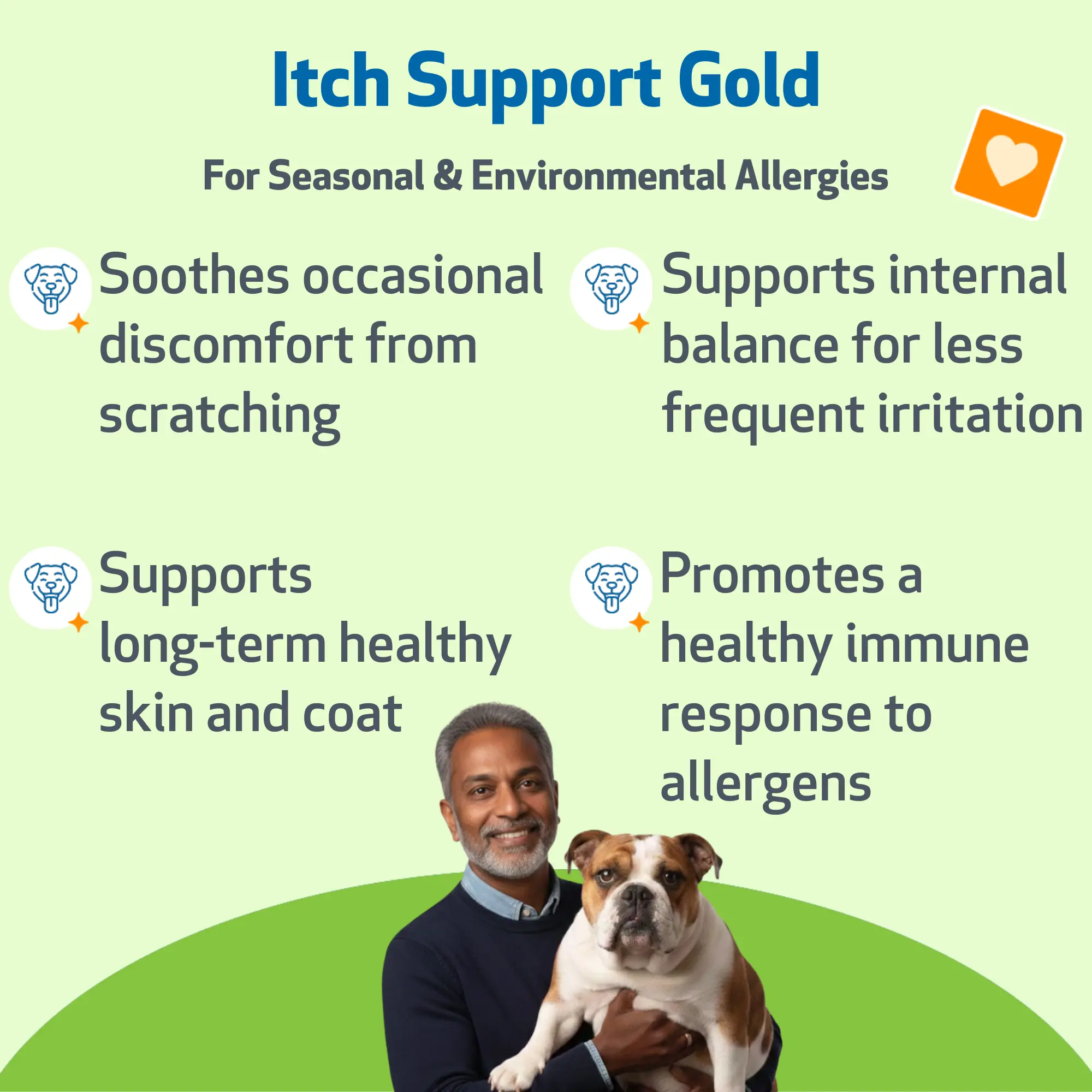Itch Support Gold is a holistic blend of nine herbal ingredients designed to support your dog's skin health during environmental or seasonal allergy sensitivities. It helps calm occasional itching and scratching, promote healthy skin integrity, and maintain normal hydration levels. 🌿