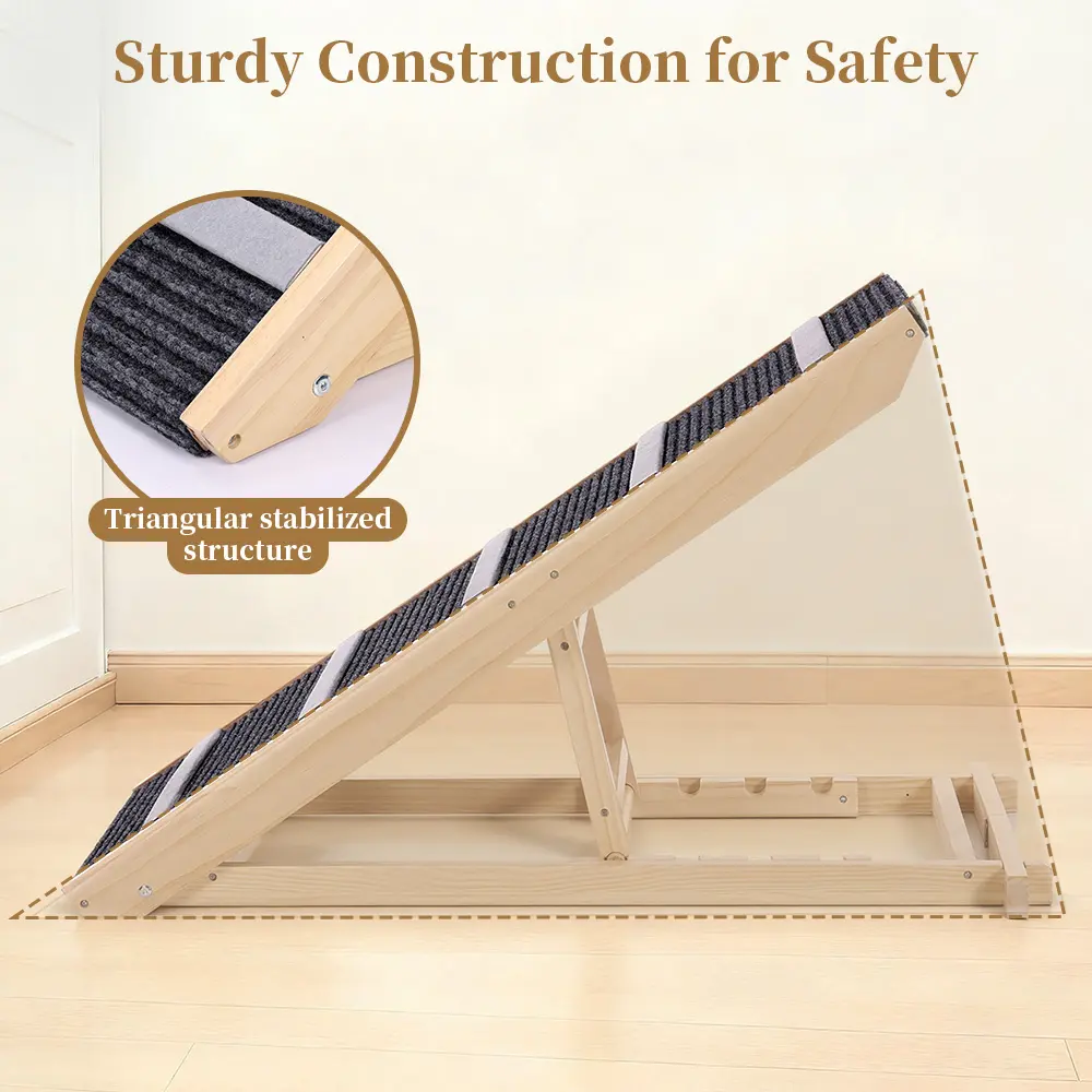 💪 Sturdy and Non-slip 💪- Solid Support: Specially lengthened legs for solid support, ensuring the ramp is stable and not easy to tip over.- Material: Made of pure natural solid wood with a thick rubber cover to prevent slipping.- Non-slip Stickers: Included for added stability.