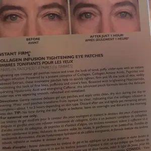 Gently remove delicate gel eye patches and apply them onto clean, dry skin during the day or evening. Wear until patches transform from opaque to clear, indicating that the collagen infusion is complete—about 1 to 2 hours, depending on skin type. Discard after use and lightly pat the remaining serum into the skin. For external use only.